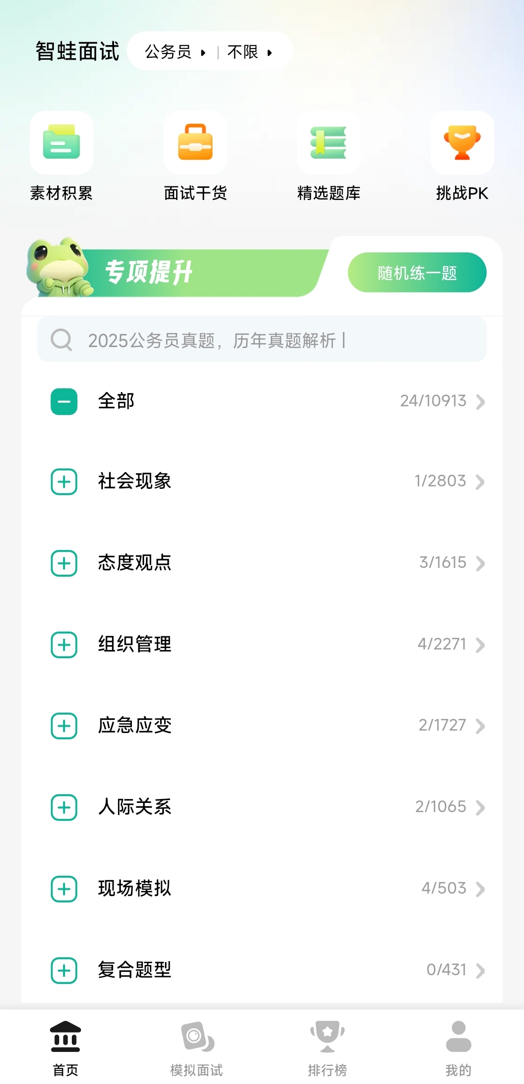 > **结论**:笔试阶段首选粉笔,**进面后的面试备考阶段,强烈推荐下载"智蛙面试App"进行高强度的人机对练。**