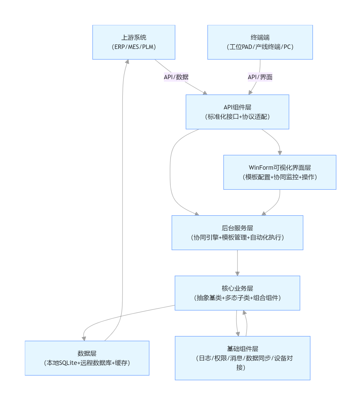 - 基础组件层:封装 MES/ERP 通用基础能力,组件化注入到核心业务层,无需重复开发。