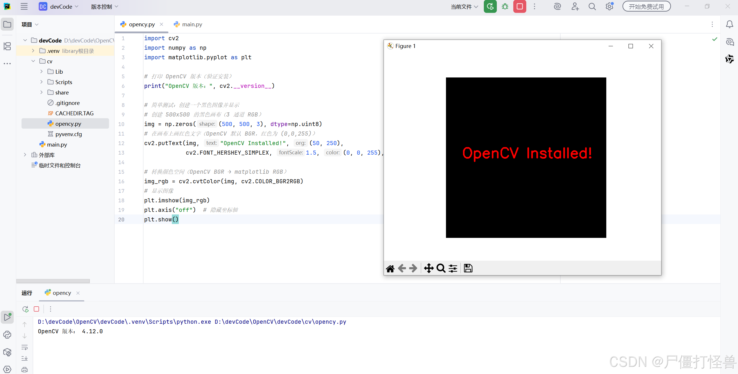 在激活的 cv 虚拟环境中,运行以下 Python 代码测试: