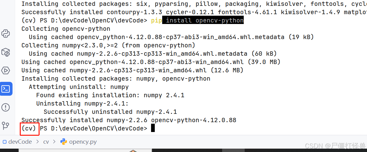 激活后命令行开头会出现 (cv),表示已进入虚拟环境。