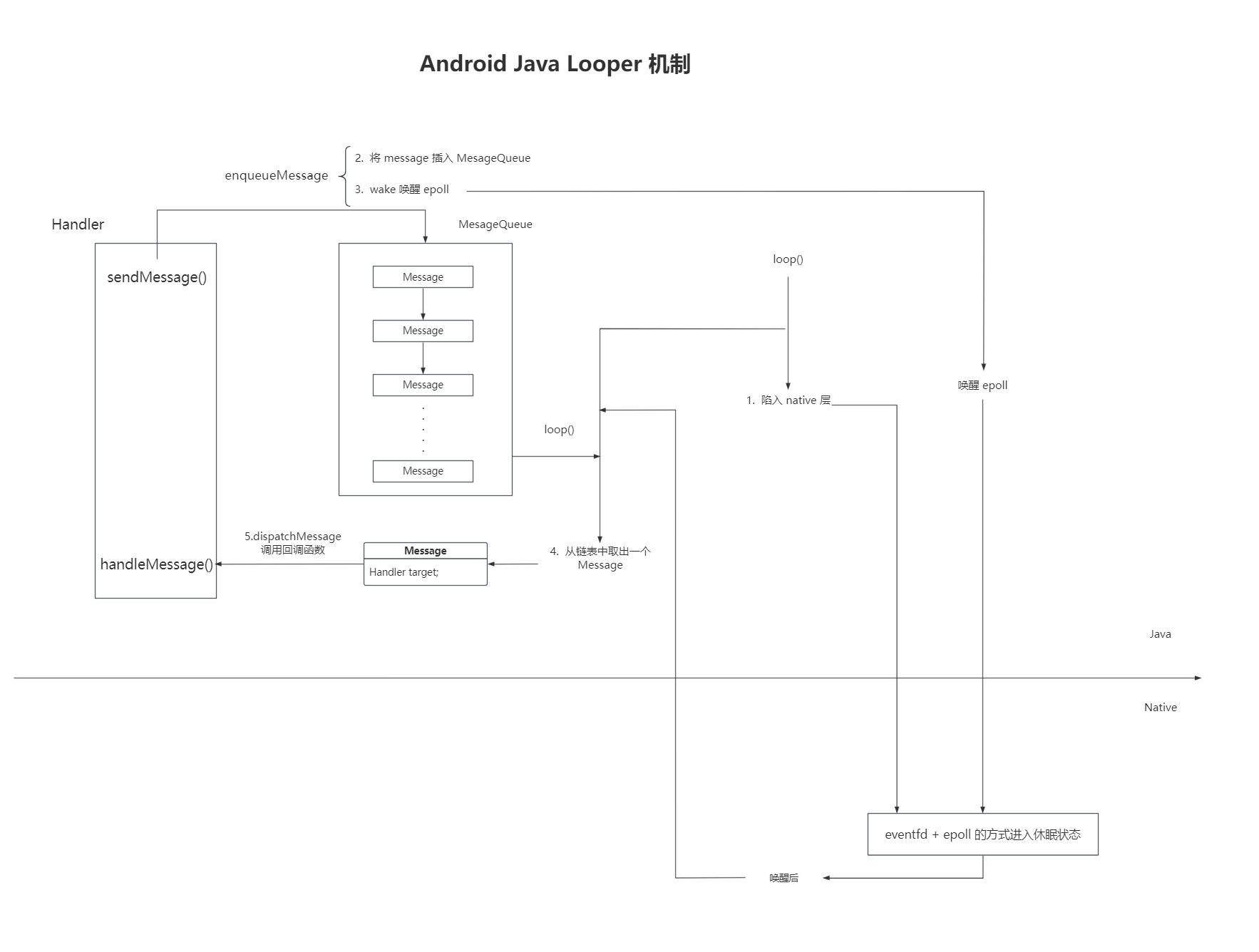 这里先给出 Android Java Looper 的整体框架图,接着我们再根据源码逐步分析