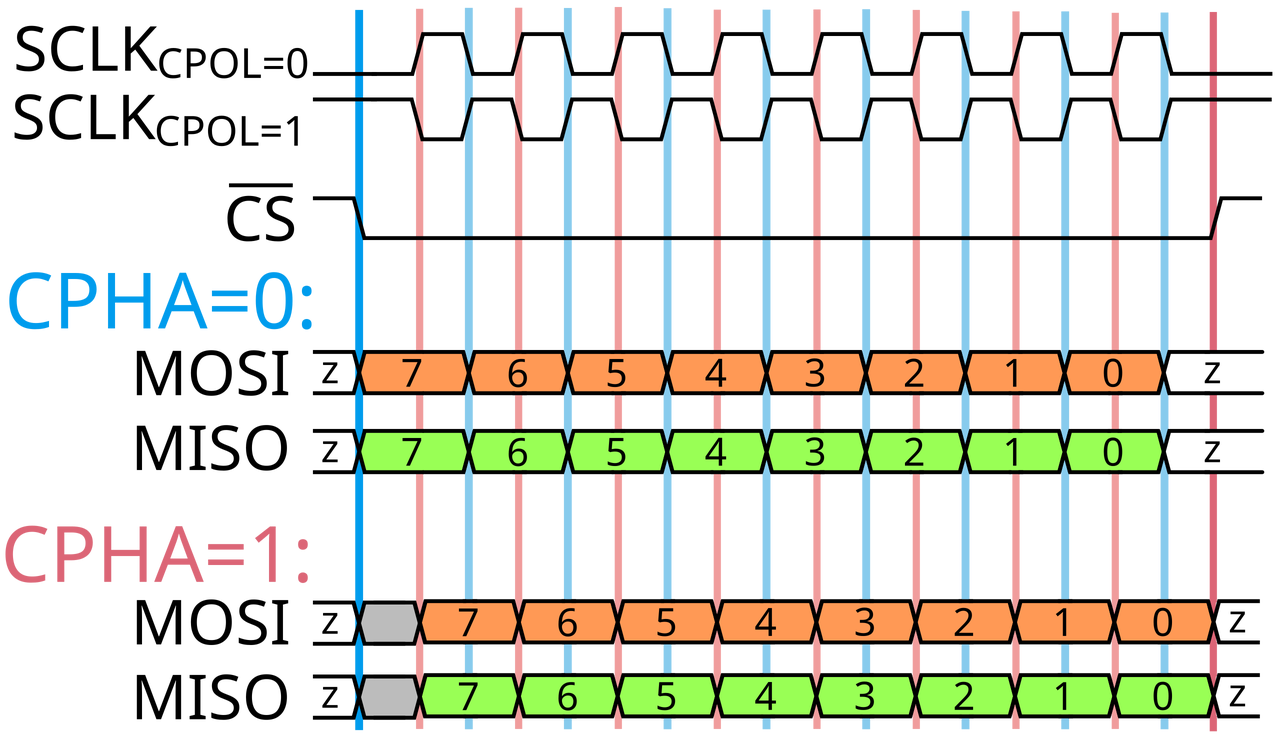 - CPOL (时钟极性):决定了SCLK在空闲状态(即CS为高电平,没有数据传输时)的电平。
