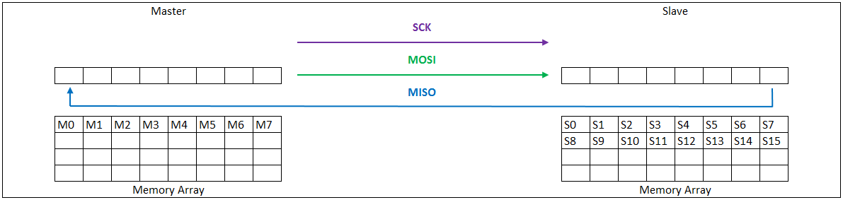 SPI通信的本质其实是"移位寄存器的数据交换"。主机和从机内部各有一个移位寄存器。在SCLK时钟的驱动下,主机寄存器里的最高位(MSB)通过MOSI线移入从机的最低位(LSB),同时从机寄存器里的最高位通过MISO线移入主机的最低位。经过8个(或更多)时钟周期后,主机和从机里的数据就完成了一次互换。