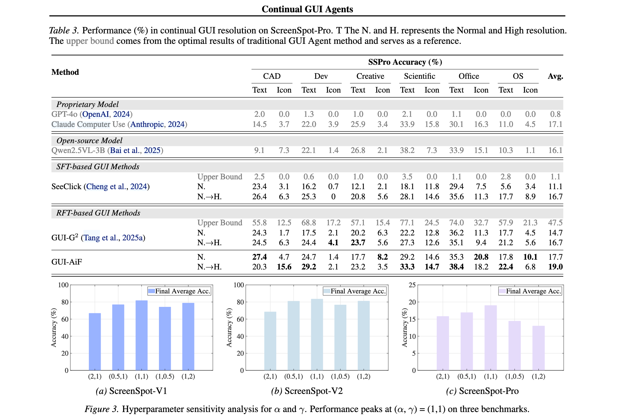 持续分辨率迁移性能 :如Table 3所示,在SSPro上,当面对正常到高分辨率迁移时,SFT和RFT基线方法获得完全相同的最终平均准确率,表明现有范式无法固有地处理分辨率变化。GUI-AiF通过促进在元素尺度和位置方面的泛化,增强了智能体应对这一挑战的性能。