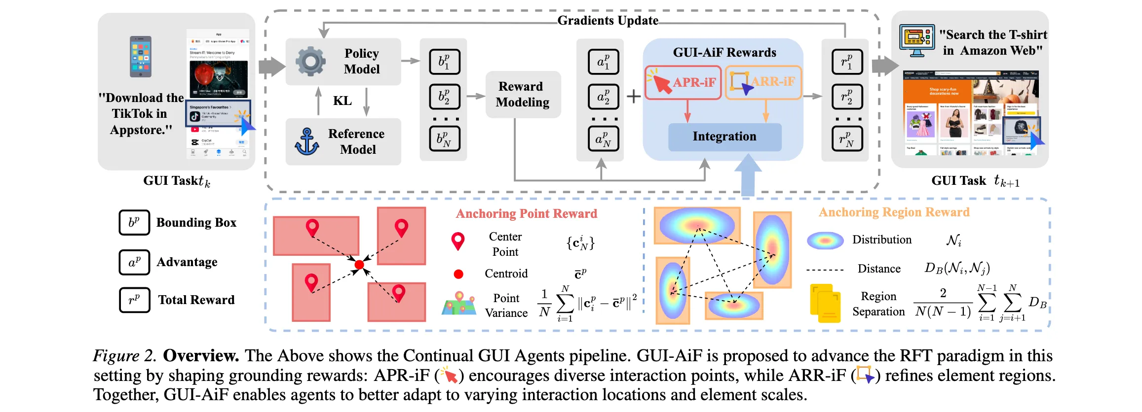 GUI-AiF框架在强化微调(RFT)范式下,通过设计新颖的奖励机制来优化grounding策略,使智能体在动态变化的GUI环境中保持稳定交互能力。框架包含问题建模、双重奖励机制和集成优化三个关键组件。如Figure 2所示,GUI-AiF在Continual GUI Agents流程中推进RFT范式,通过塑造grounding奖励来优化策略:APR-iF鼓励多样化交互点,ARR-iF细化元素区域,两者共同使智能体更好地适应变化的交互位置和元素尺度。