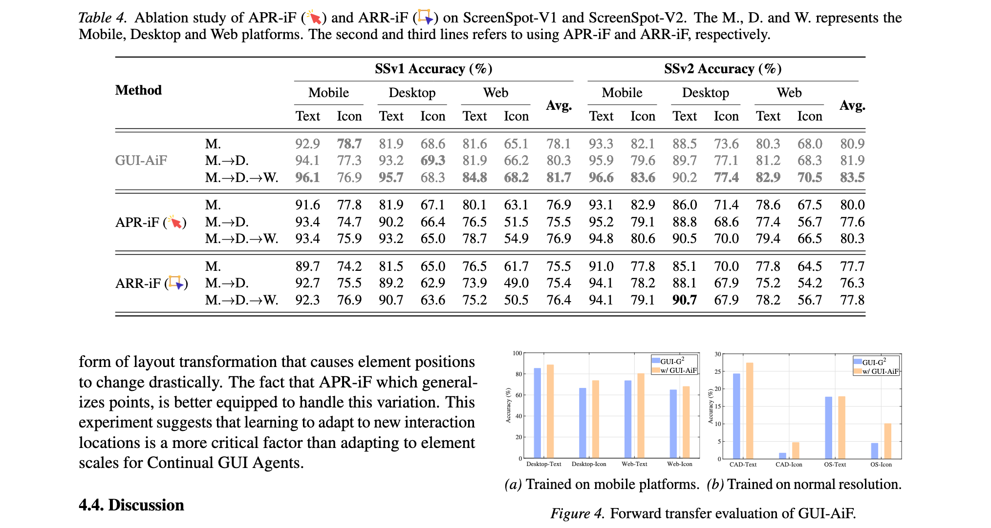 前向迁移评估 :如Figure 4所示,GUI-AiF增强了智能体的前向迁移能力,使其能够利用从先前任务中学到的知识泛化到后续任务。在移动平台训练后,GUI-AiF在后续桌面和Web平台上的性能超过相应基线,类似改进也出现在分辨率迁移场景中。