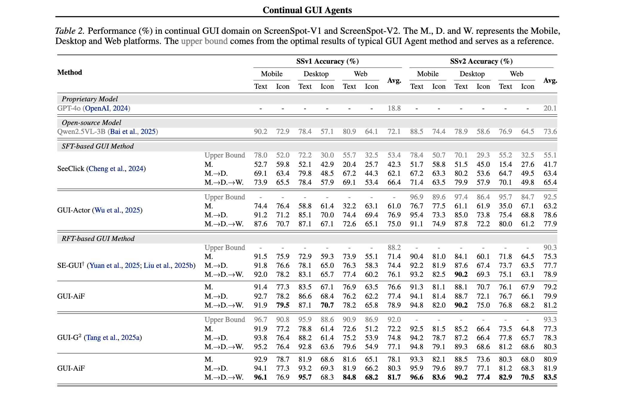 持续域迁移性能 :如Table 2所示,在SSv1和SSv2上,GUI-AiF在域迁移场景下表现出色。专有模型(如GPT-4o)在GUI任务中表现挣扎,SFT方法(SeeClick和GUI-Actor)性能普遍较差,验证了其在单一GUI任务中的过度适应倾向。RFT基线方法(如SE-GUI和GUI-G2)显示出一定适应能力,但GUI-AiF进一步提升了持续性能,增强了智能体面对域迁移时的适应能力。每个任务训练后单域性能增加,表明GUI-AiF能够从已学习任务中累积知识。