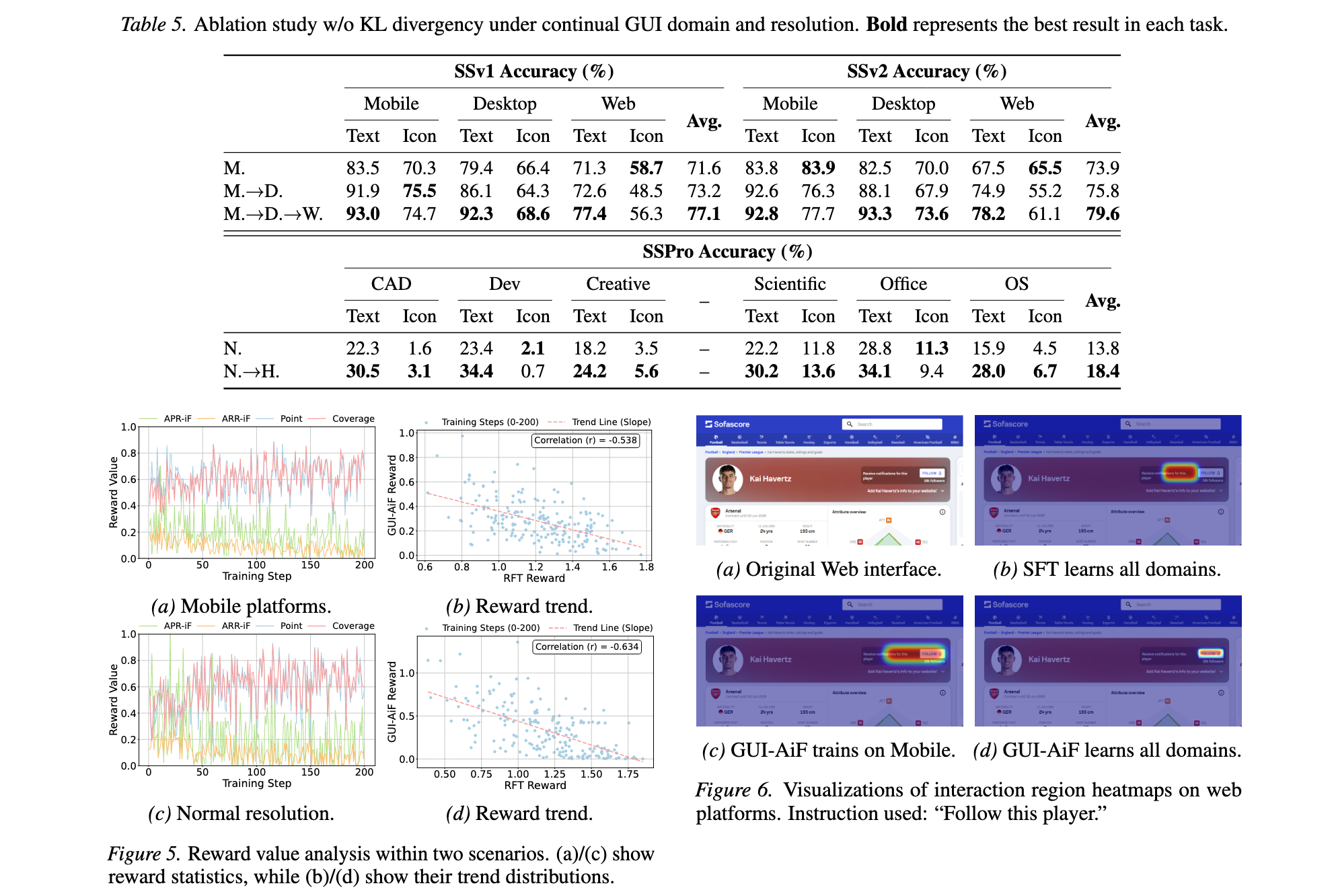 KL散度正则化作用:如Table 5所示,移除KL项会降低GUI智能体的持续学习性能,表明仅追求多样化解决方案是不够的。KL项提供了稳定基础,确保GUI-AiF是grounded的,帮助智能体适应动态GUI任务。