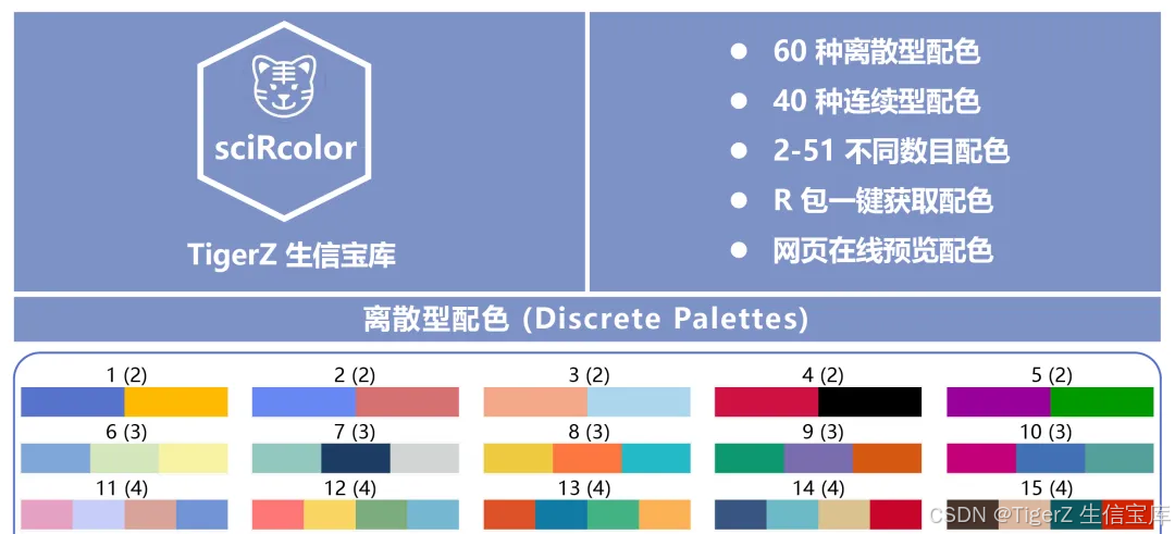 sciRcolor 项目用于解决 R 语言科研绘图中颜色选择的问题,包含了 100 种常用配色(60 种离散色 + 40 种连续色 )。并且提供了一个用来预览配色的在线网站 ,以及用来获取配色的 R 包。详细信息见: