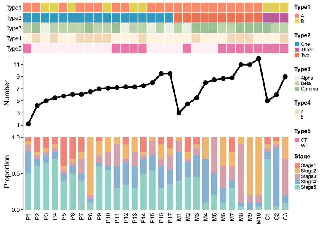 **原图解读:**该图是由色块图、折线图、柱状图三图组合而成的复杂图形。绘制了来自 GSE131907 和 GSE123904 中 30 例肺腺癌(lung adenocarcinoma, LUAD)患者的临床和分子特征。患者按照三个样本来源中恶性细胞数量的顺序排列。每个患者贡献的细胞比例和细胞类型用不同颜色表示。