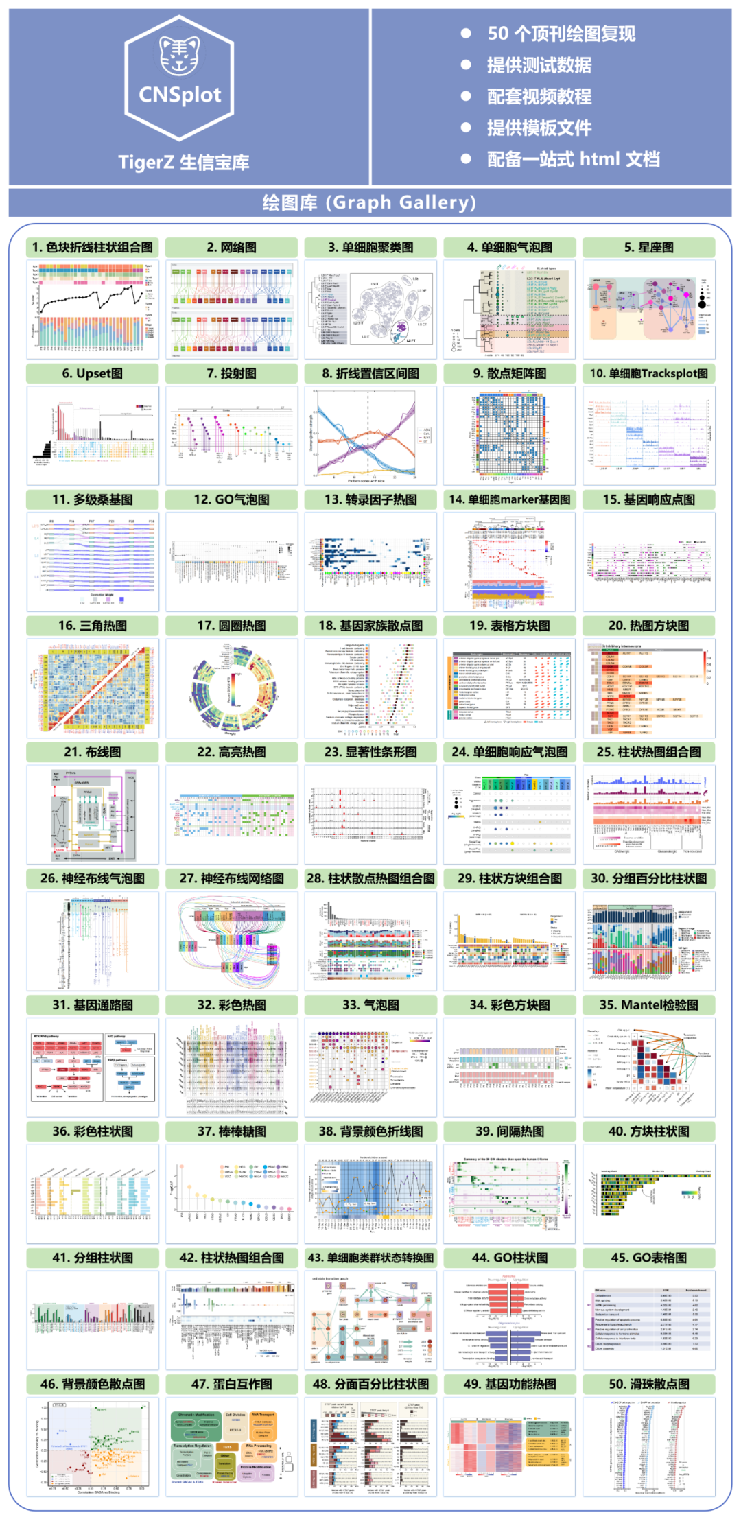 CNSplot 专门针对科研绘图中的高级复杂图形,包含了 50 个顶刊绘图复现,每个绘图都提供了测试数据/模板文件 。所有绘图代码都整理到了一个 html 文档 中,并且还配套了视频教程。详细信息见: