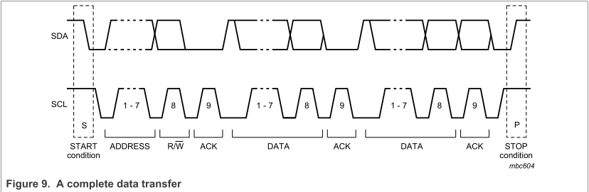 - 寻址:通信开始后,主机发送 7 位(或 10 位)的目标设备地址,并指定读写方向(R/W 位)。