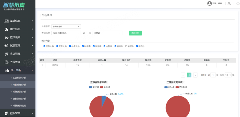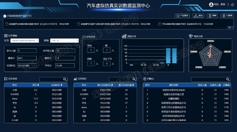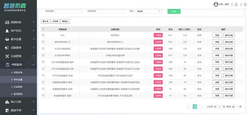 汽车虚拟仿真智慧综合管理平台统一管理所有的虚拟仿真管理平台,集基础信息、技能试卷设置、考务组织、智能评分、记录管理、考核监控、多维度统计分析等功能为一体的智慧综合管理平台,适合各类场景下的实训管理、考务组织等。让实训操作数据化,考核过程可监控、评分智能化,成绩分析多维度,考务组织省时、省力、省耗材。