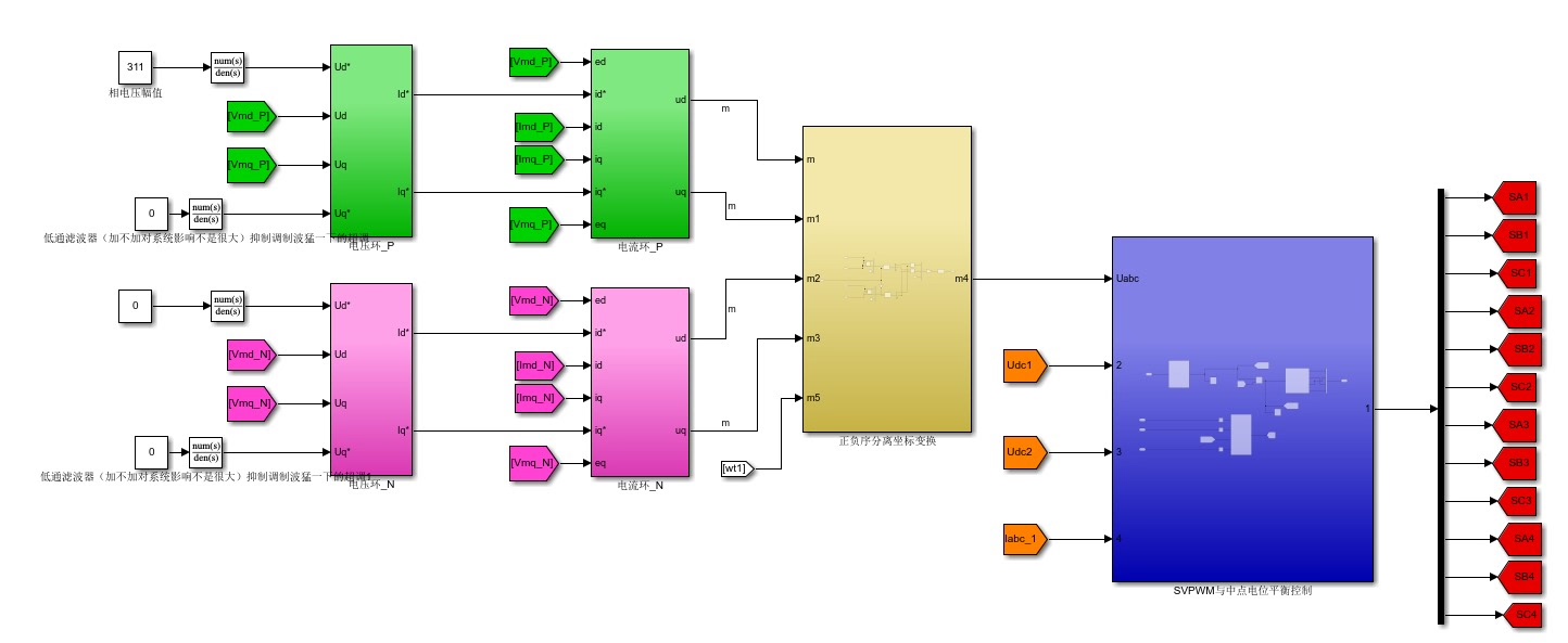 最近在搞三电平逆变器带不平衡负载的仿真,发现这玩意儿还真有点意思。特别是用延时相消法处理正负序分量的时候,系统稳定性跟变魔术似的------调对了参数就能让波形立正站好。今天就拿T型三电平NPC拓扑开刀,咱们边写代码边唠嗑。