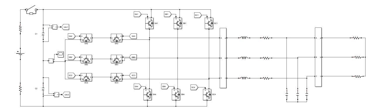 先看主电路拓扑,T型结构相比传统NPC多了个箝位支路。仿真模型里我用的是Simulink自带的Three-Level Neutral Point Clamped桥臂模块,关键参数设置记得把直流母线电容拆成两个375V的。这里有个坑:NPC拓扑的直流中点电压平衡直接影响输出质量,所以后面得专门搞均压控制。