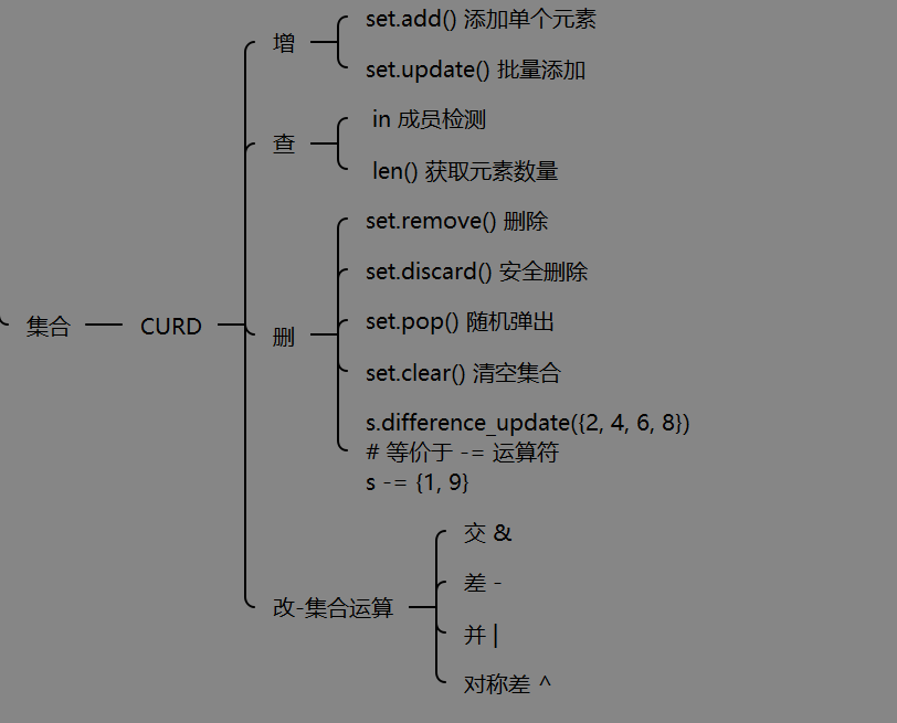 | 删除 | remove(), discard(), pop(), clear() |