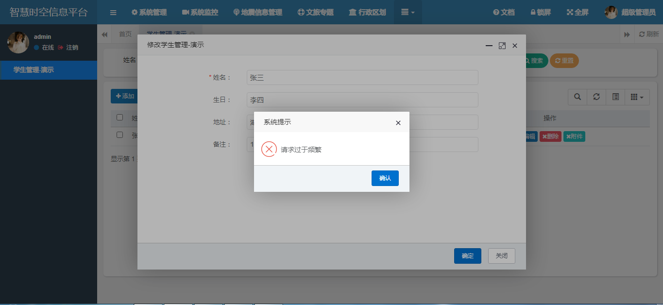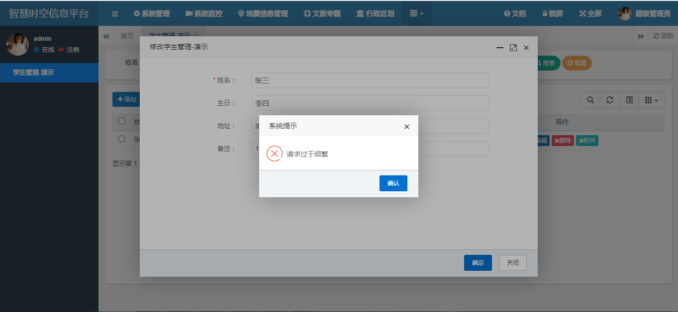 这里的核心就是:@RepeatSubmit(interval = 3000, message = "请求过于频繁")。这里表示使用间隔时间是3秒内提交重复参数都将视为重复提交。下面来看看实际的案例。