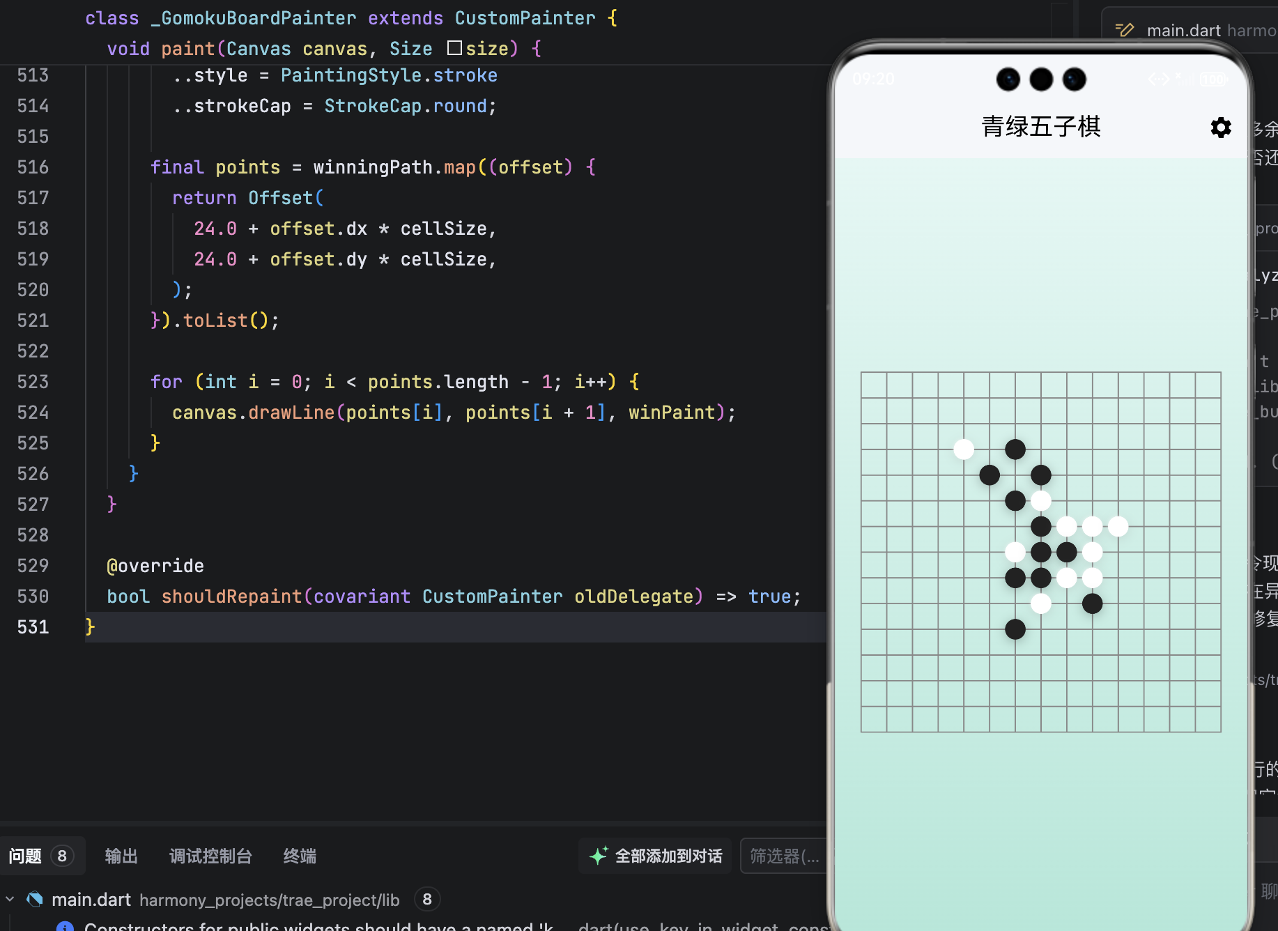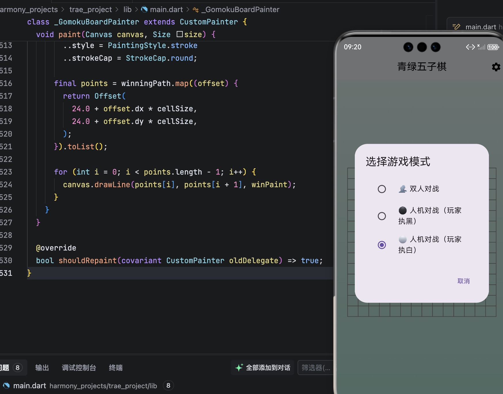 在上一篇《从零开始:用 Flutter + OpenHarmony 构建青绿山水风五子棋(一)》中,我们成功实现了双人对战的核心功能------15×15 棋盘、玉石质感棋子、五子连珠判定,以及极具东方美学的青绿山水界面。然而,真正的挑战往往始于"独处":当你深夜想下一盘棋,却找不到对手时,一个智能、可靠、有策略感的 AI 对手便成了不可或缺的伙伴。