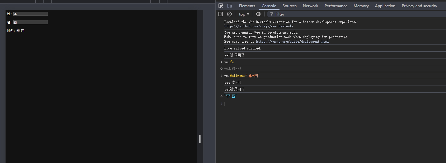 fullname的逻辑:get函数 :当首次渲染或firstname/lastname变化时,自动调用并返回拼接结果(如"张-三")。控制台会输出get被调用了,便于调试。set函数 :若需修改fullname(如直接给vm.fullname赋值),set会接收新值(如"李-四"),拆分后更新firstname和lastname,实现双向响应。