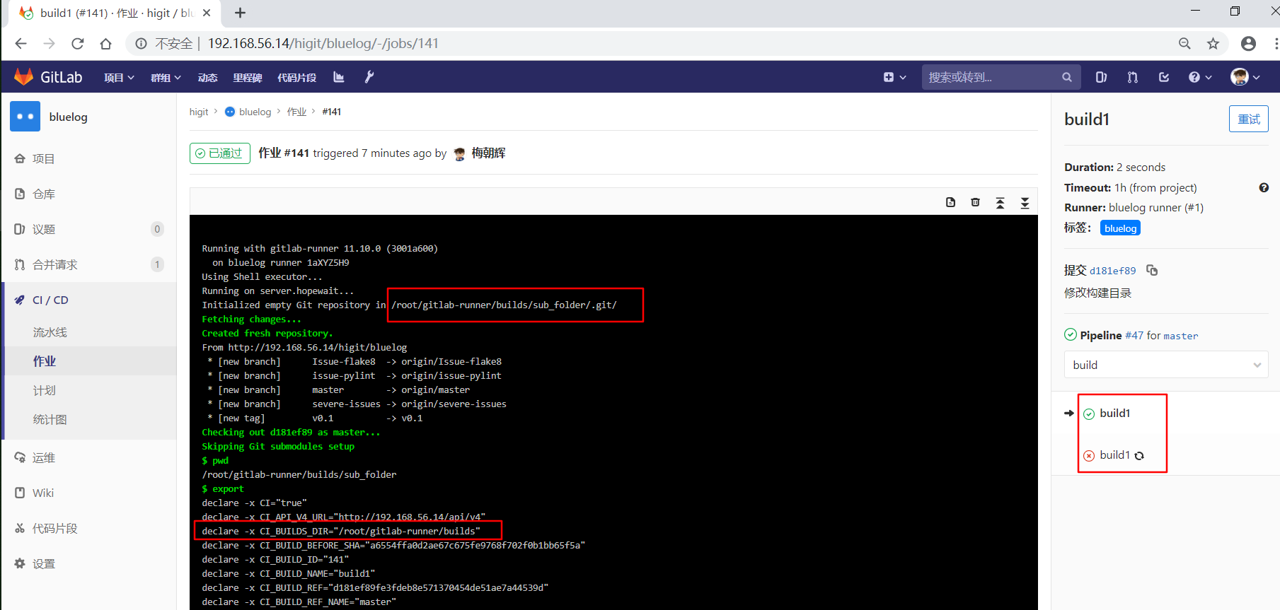 可以看到"build1"作业使用作业级定义的GIT_CLONE_PATH: $CI_BUILDS_DIR/sub_folder,仓库会被下载到/root/gitlab-runner/builds/sub_folder目录下。