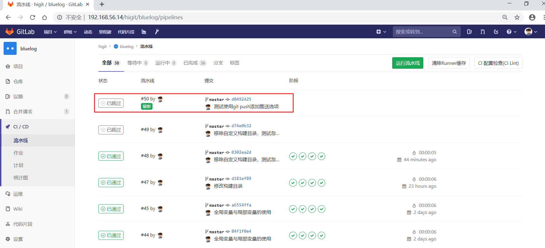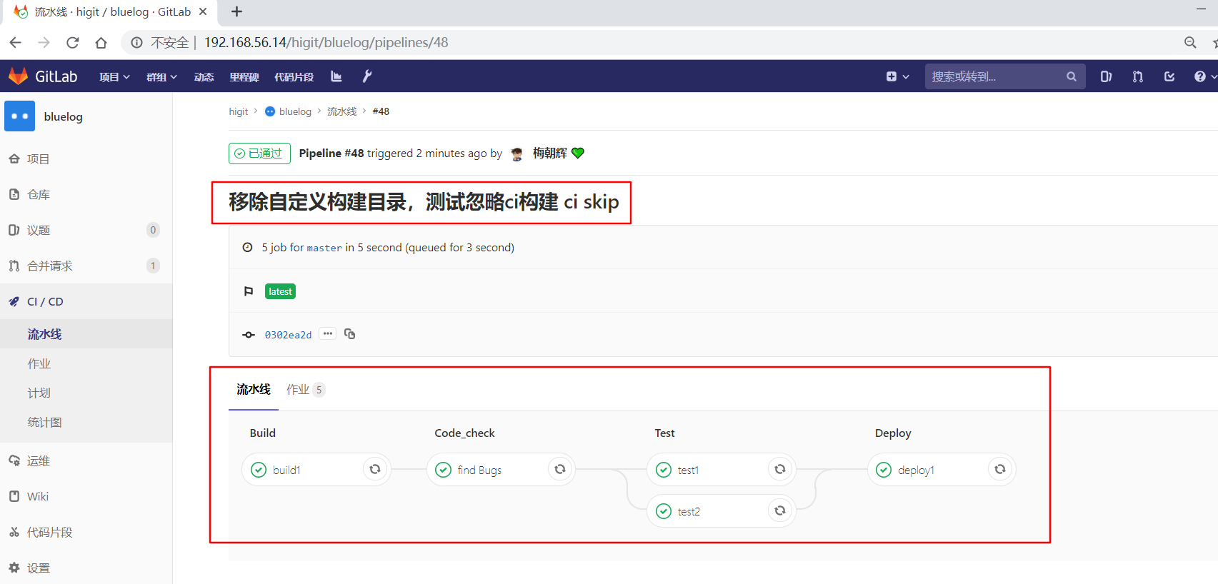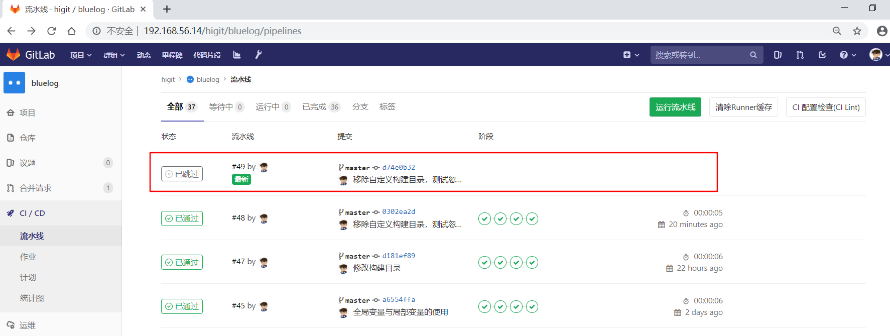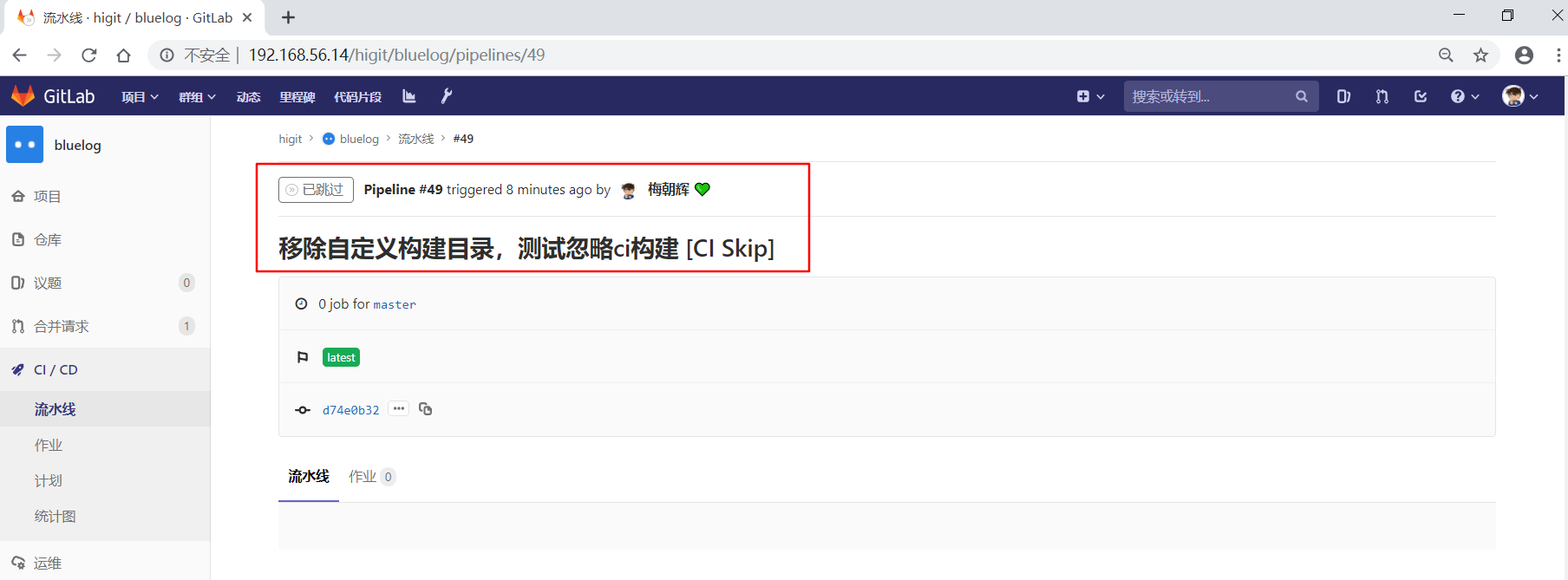 我们第一次修改配置文件,commit日志为"移除自定义构建目录,测试忽略ci构建 ci skip",包含有ci skip关键字,但是没有左右中括号,进行提交: