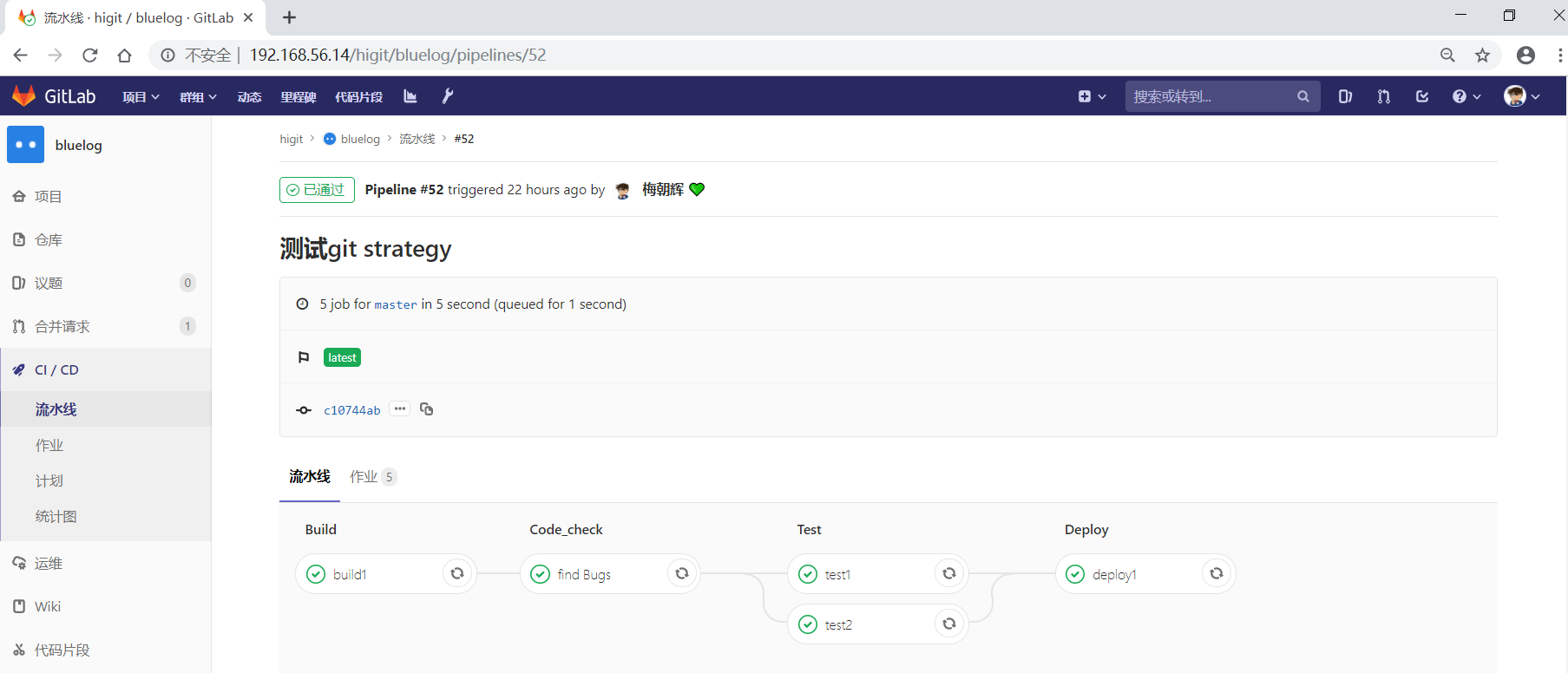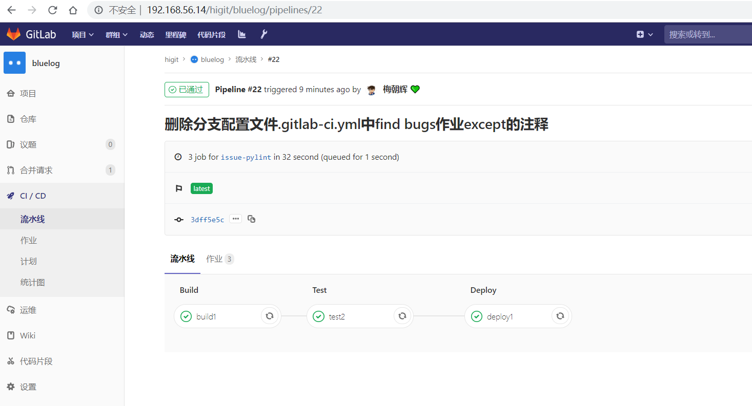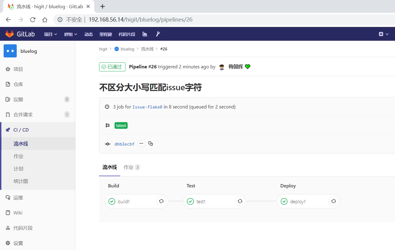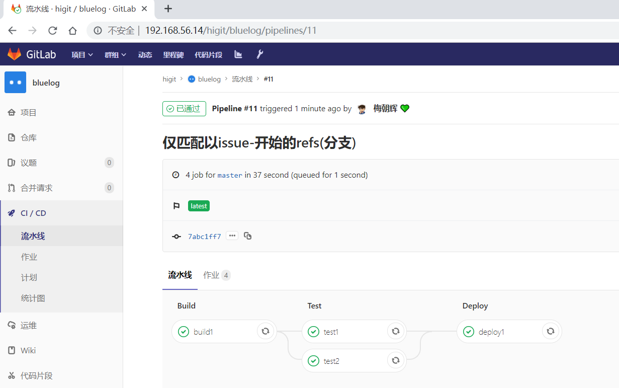 可以发现其 build 、Test 、Deploy三个阶段的任务都执行成功!