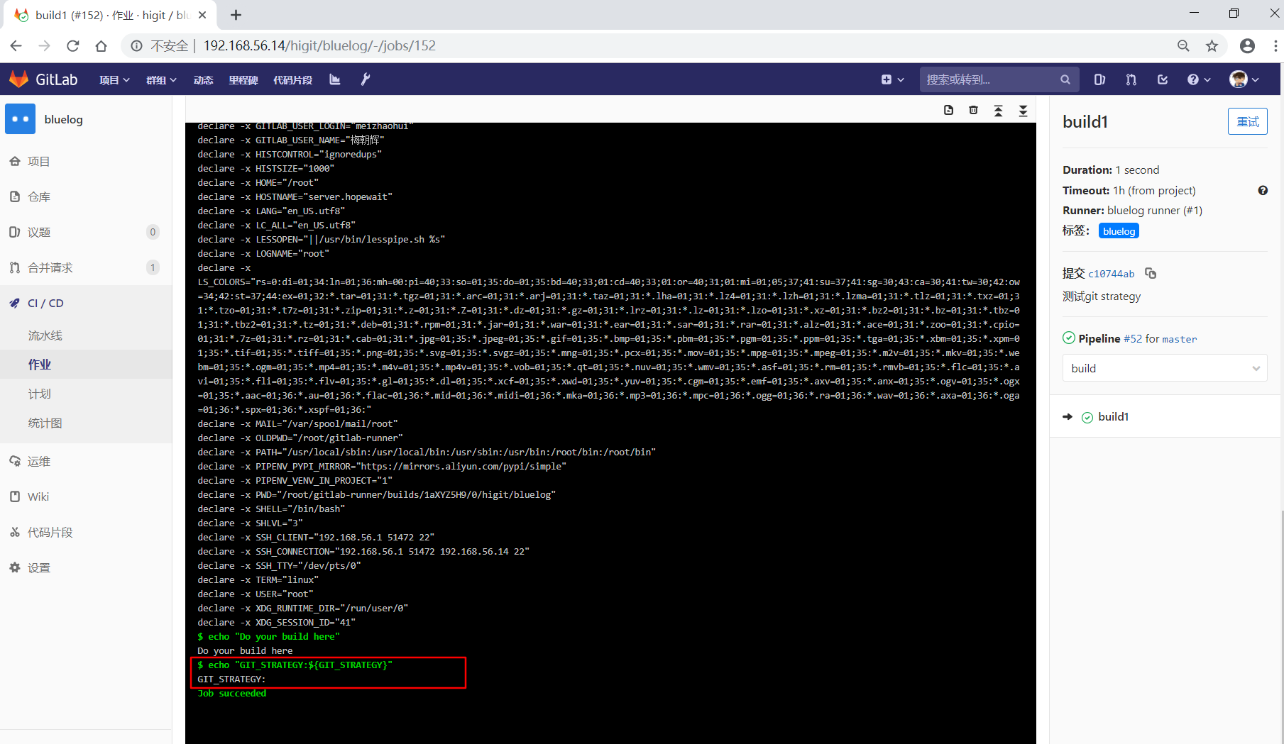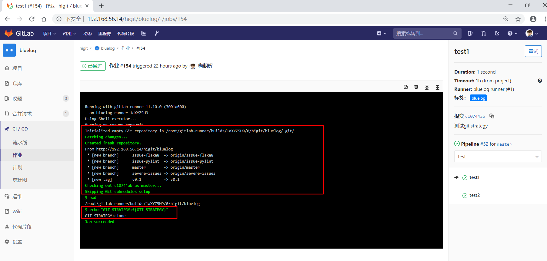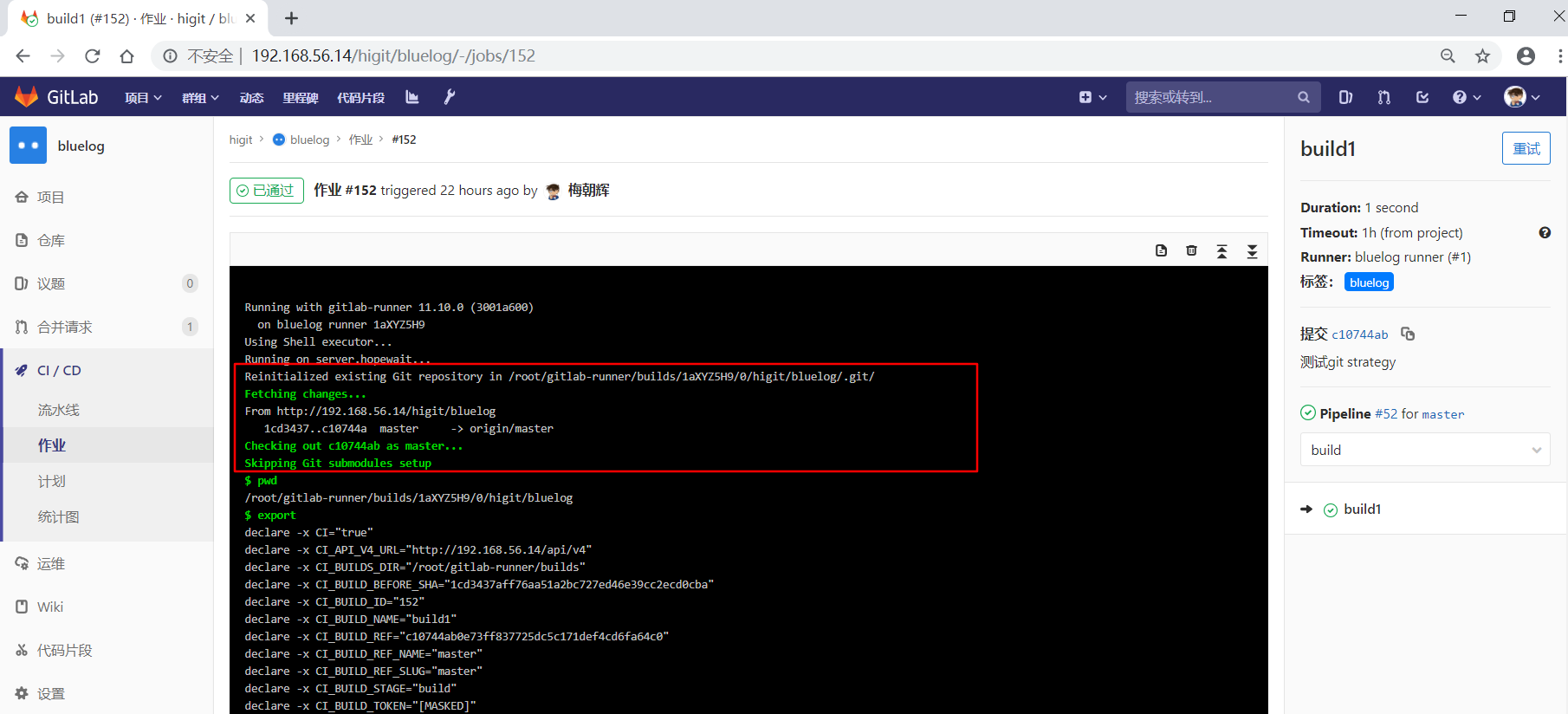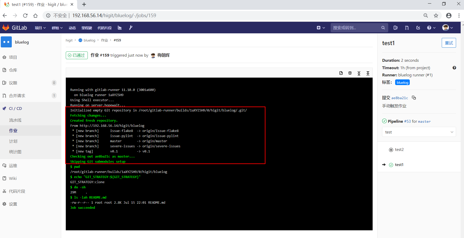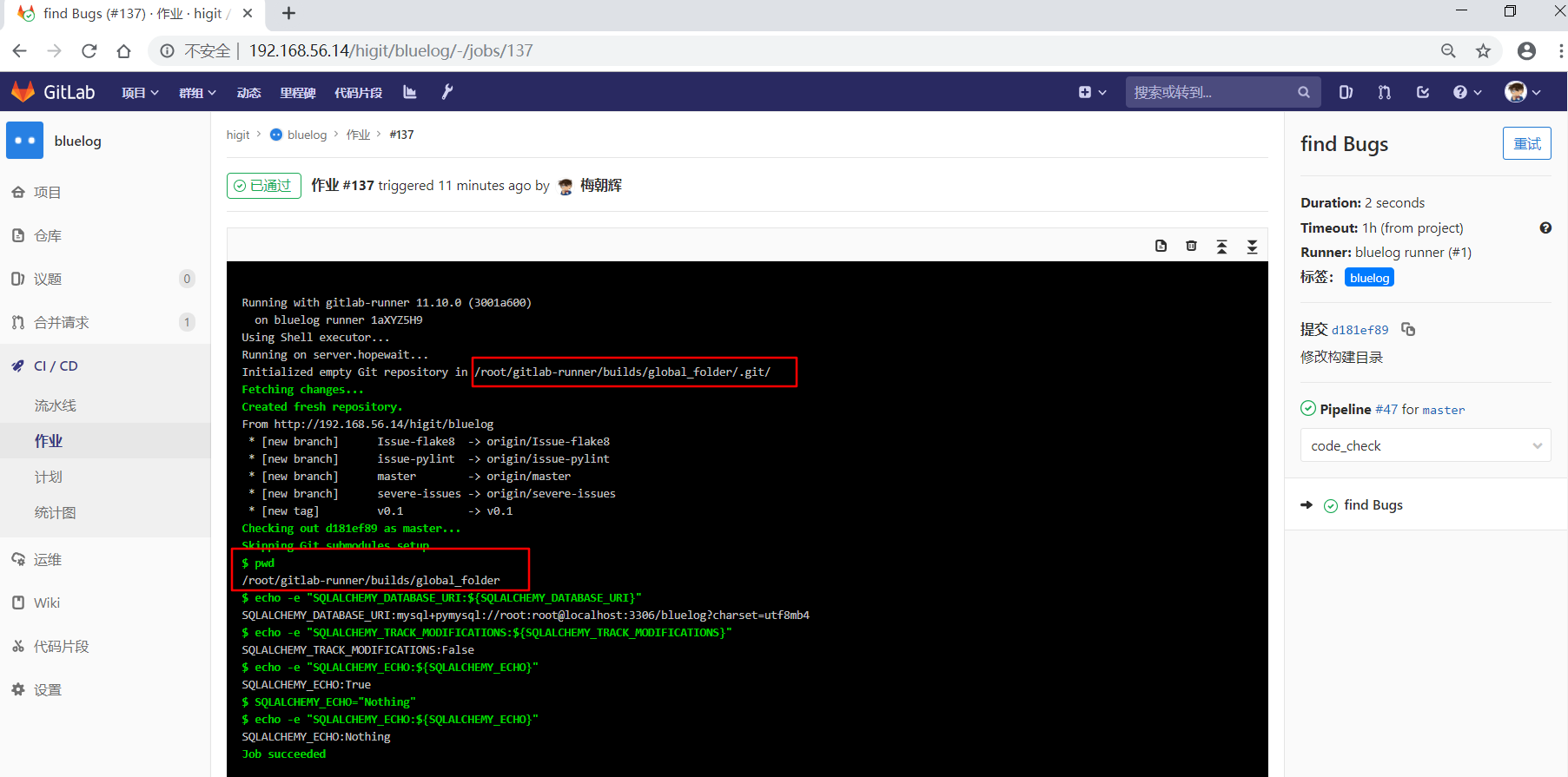 可以看到"build1"作业使用全局级定义的GIT_CLONE_PATH: $CI_BUILDS_DIR/global_folder,仓库会被下载到/root/gitlab-runner/builds/global_folder目录下。