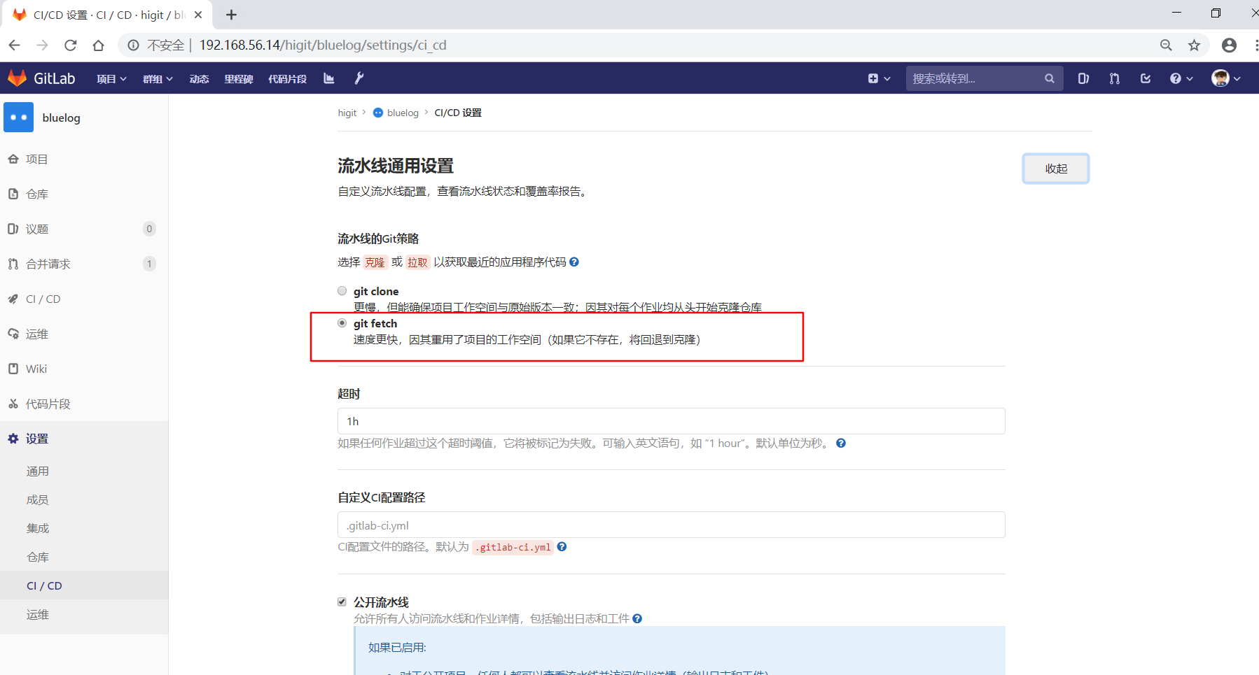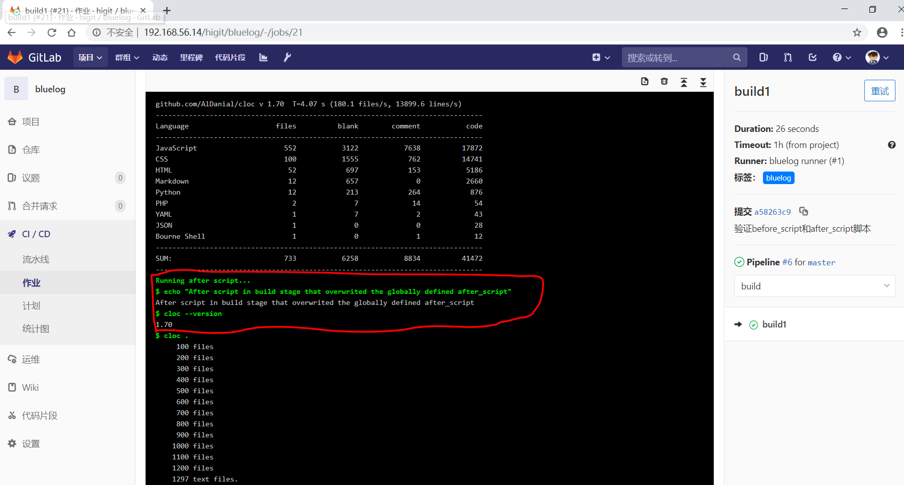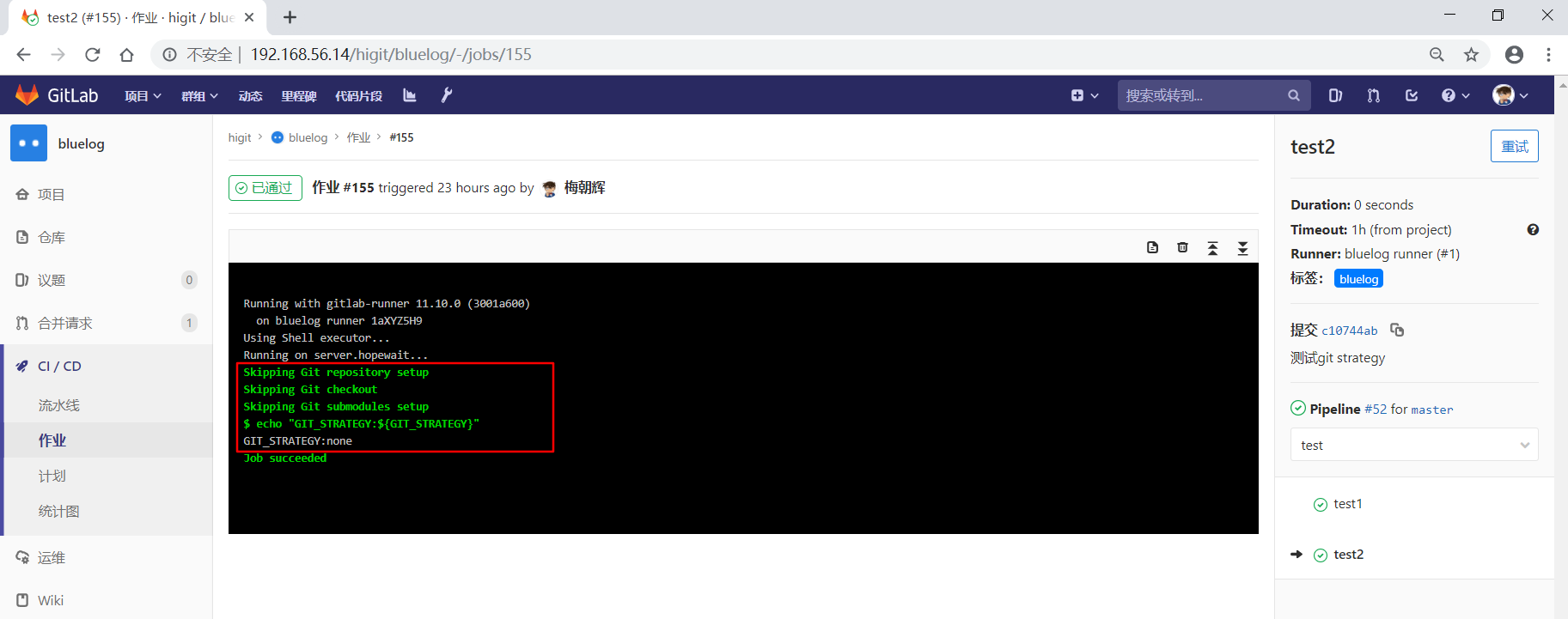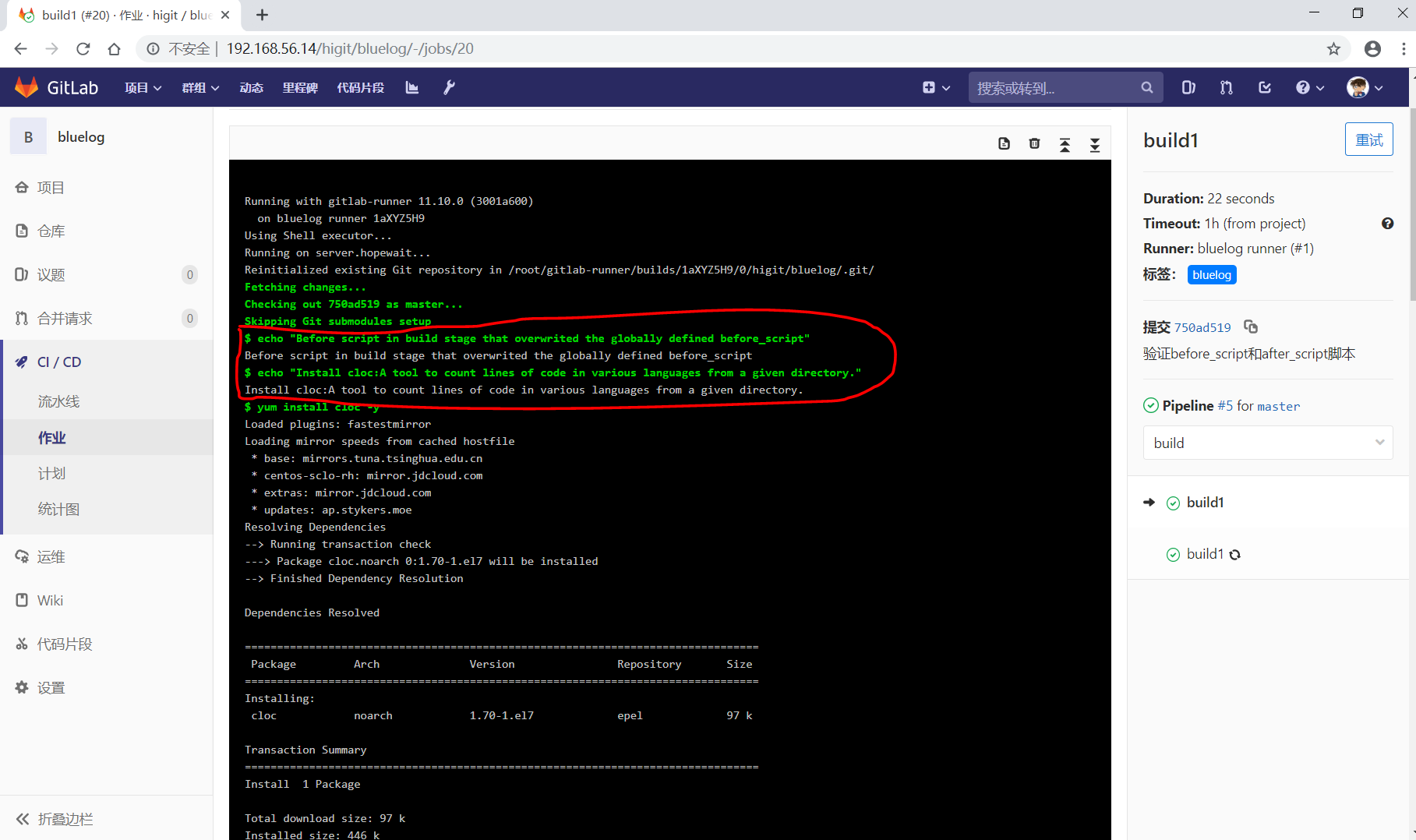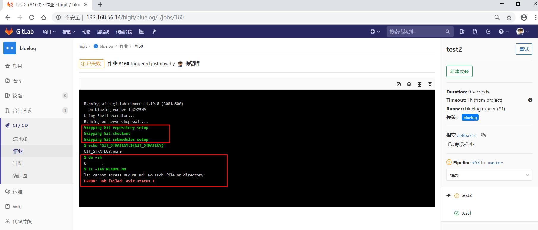 可以看到"build1"作业使用全局级定义的GIT_CLONE_PATH: $CI_BUILDS_DIR/global_folder,仓库会被下载到/root/gitlab-runner/builds/global_folder目录下。