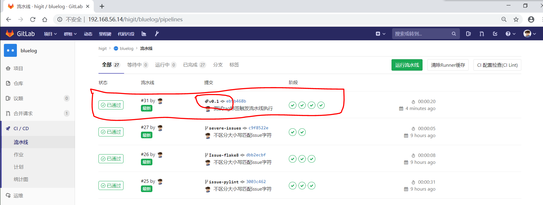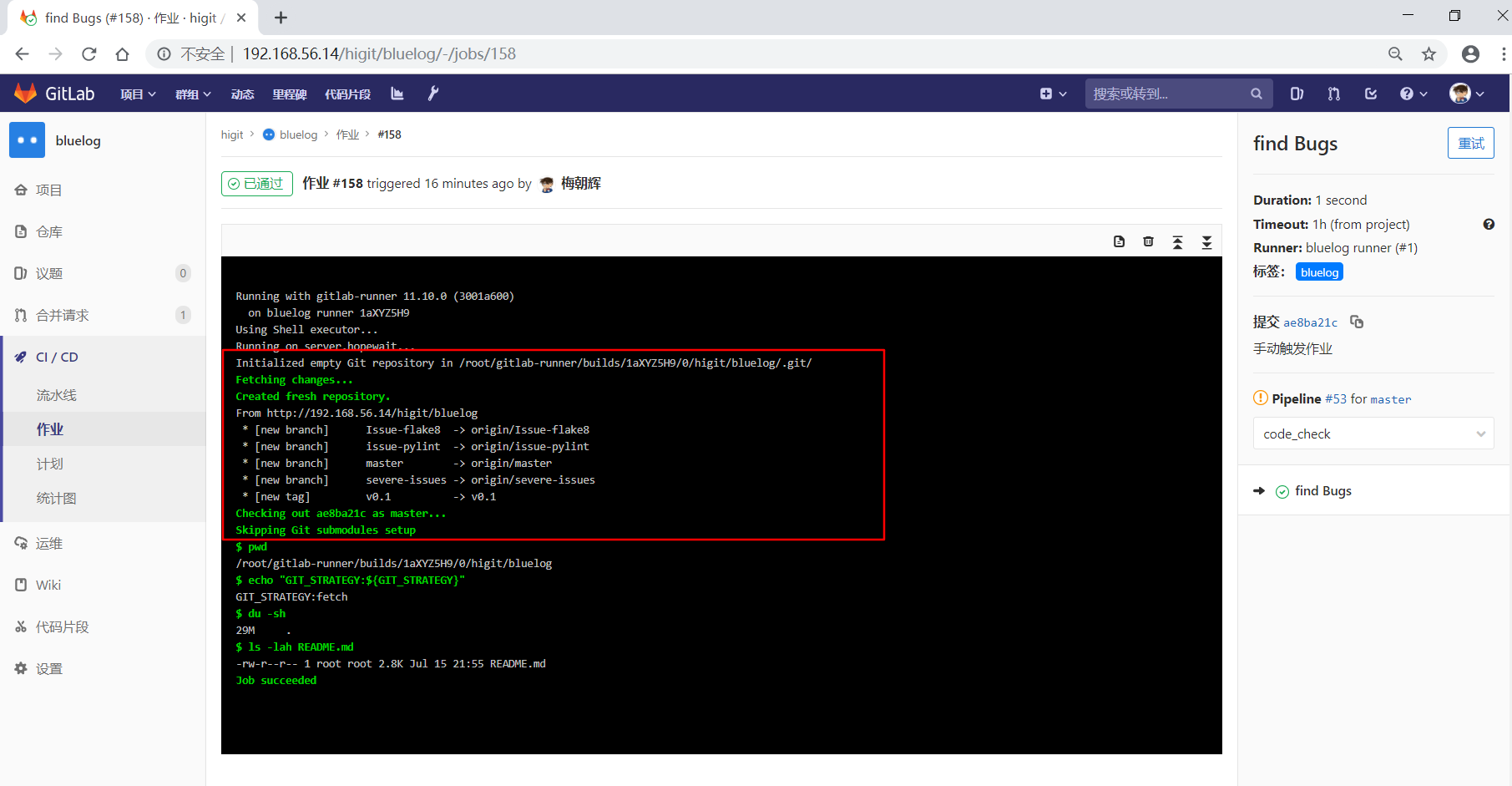 之前我们配置的bluelog的4#流水线已经已通过了: