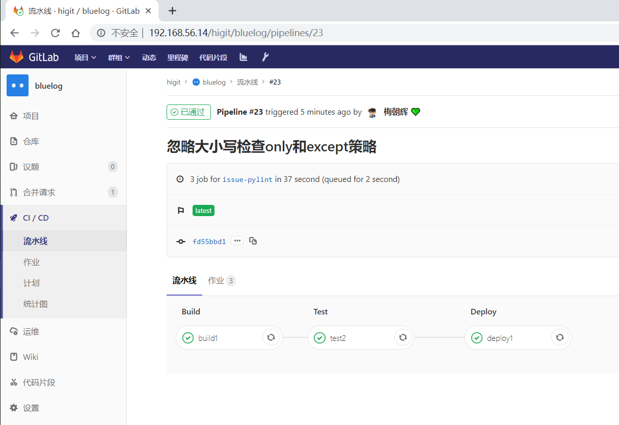 .gitlab-ci.yml文件,并配置项目的运行器(GitLab Runner),那么后续的每次提交都会触发CI流水线(pipeline)的执行。 -