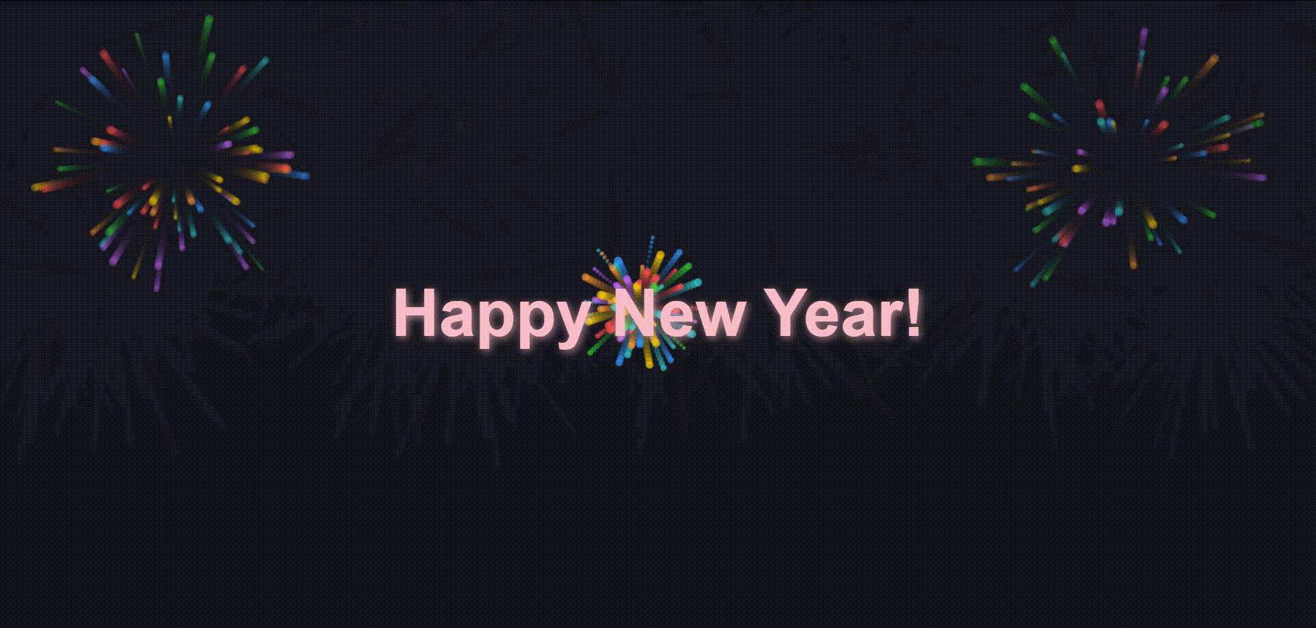 #14141E)模拟夜空氛围,增强烟花色彩的对比度与视觉冲击力。 - 在页面中央添加"Happy New Year!"文字,采用柔和粉色调与阴影效果,营造节日喜庆感。