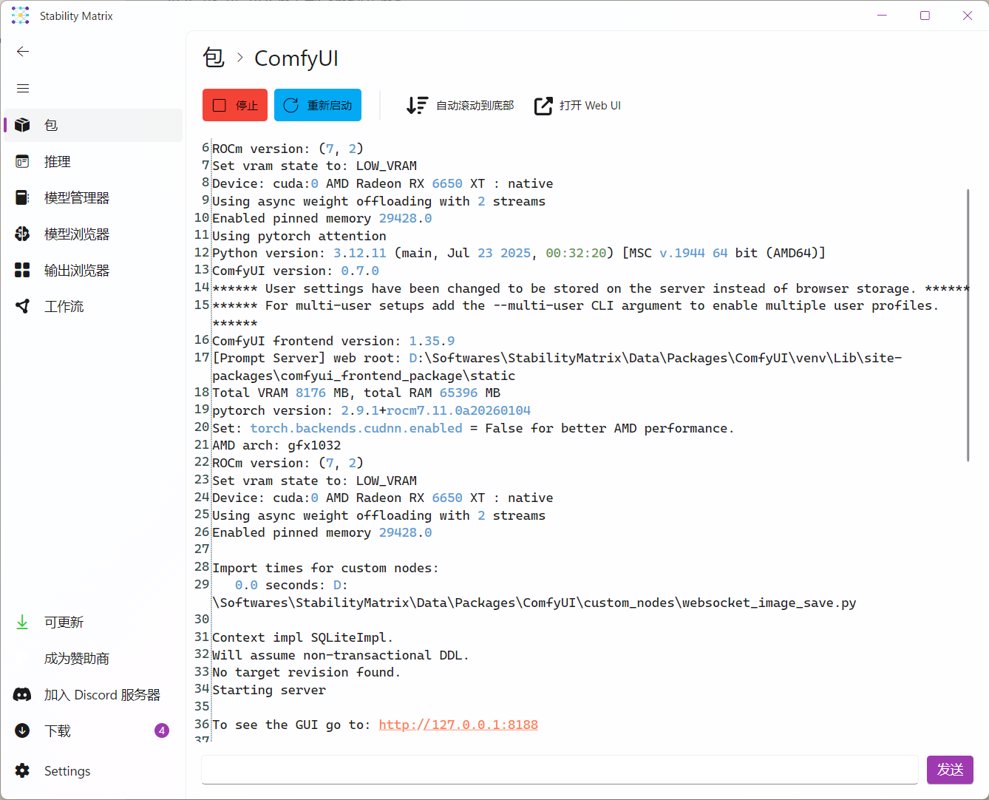 虽然报错了有点小尴尬,但是日志中的 Device: cuda:0 AMD Radeon RX 6650 XT : native 这一行非常迷人
