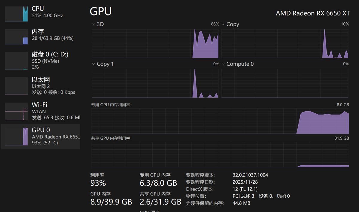 从任务管理器中能清晰看到,AMD 显卡的利用率直接拉满------这才是真正发挥出了 GPU 的性能优势!相比之前的 CNN 训练任务,AI 画图对算力的需求更高,也更能体现出 ROCm 环境搭建的价值。