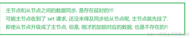 服务器1 向 master 节点进⾏加锁操作. 这个写⼊ key 的过程刚刚完成, master 挂了; slave 节点升级成了新的 master 节点. 但是由于刚才写⼊的这个 key 尚未来得及同步给 slave 呢, 此时就相当于 服务器1 的加锁操作形同虚设了, 服务器2 仍然可以进⾏加锁 (即给新的 master 写⼊ key. 因为新的 master 不包含刚才的 key)