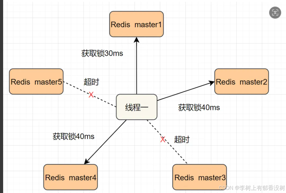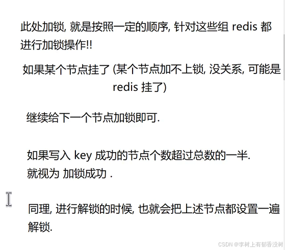 我们引⼊⼀组 Redis 节点. 其中每⼀组 Redis 节点都包含⼀个主节点和若⼲从节点. 并且组和组之间存储的数据都是⼀致的, 相互之间是 "备份" 关系(⽽并⾮是数据集合的⼀部分, 这点有别于 Redis cluster).加锁的时候, 按照⼀定的顺序, 写多个 master 节点. 在写锁的时候需要设定操作的 "超时时间". ⽐如50ms. 即如果 setnx 操作超过了 50ms 还没有成功, 就视为加锁失败.