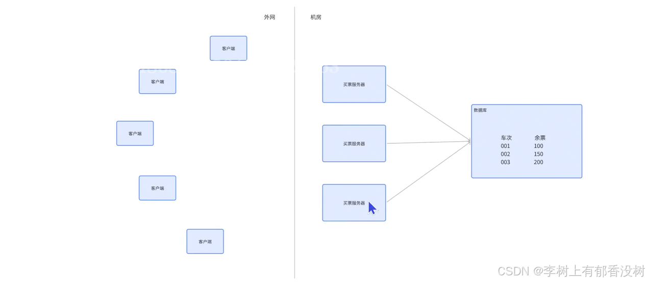现在存在多个服务器节点, 都可能需要处理这个买票的逻辑: 先查询指定⻋次的余票, 如果余票 > 0, 则设置余票值 -= 1.