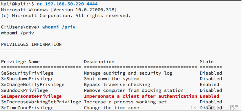 SeImpersonatePrivilege这张"许可证",临时模拟成那个普通用户。这样一来,它就能以该用户的合法身份顺利访问文件,就像用户自己在操作一样。