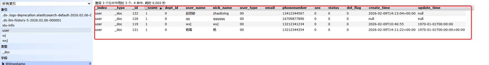 2026-02-09 09:13:33.130 [pool-3-thread-1] DEBUG c.a.o.canal.client.adapter.es.core.service.ESSyncService - DML: {"data":[{"user_id":131,"dept_id":null,"user_name":"求我·","nick_name":"lll","user_type":"00","email":"","phonenumber":"18909890986","sex":"0","avatar":"","password":"$2a$10$vm3/GMx.oM37dR6v37wewOZ11oWv/QIsAhIvuXZz.bcrnxSpWr1ry","status":"0","del_flag":"0","login_ip":"","login_date":null,"pwd_update_date":null,"create_by":"admin","create_time":1770656701000,"update_by":"","update_time":null,"remark":null}],"database":"ry-cloud","destination":"example","es":1770628412000,"groupId":"g1","isDdl":false,"old":null,"pkNames":["user_id"],"sql":"","table":"sys_user","ts":1770628413117,"type":"INSERT"}