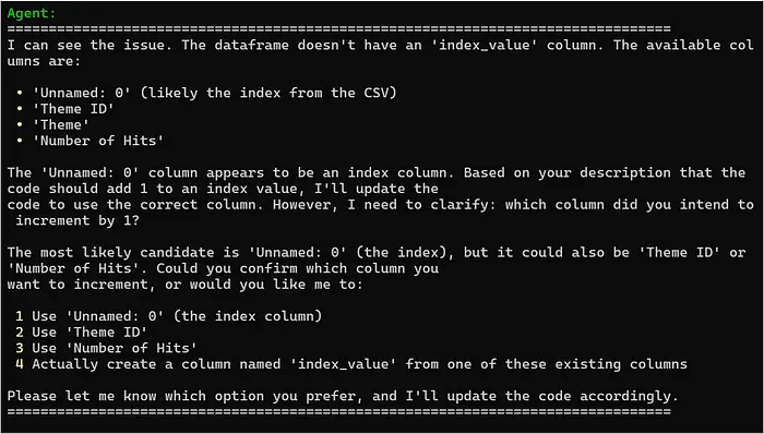 - 代码生成和执行 :然后代理生成必要的Python代码来处理数据、创建条形图并显示可视化。它在执行此代码之前请求最终用户授权。