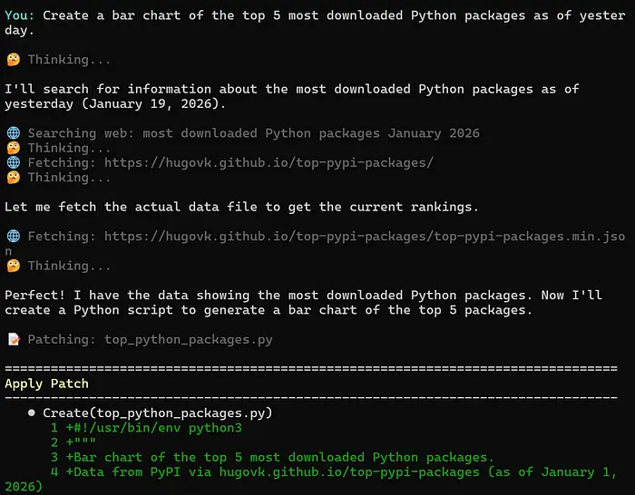在生成前5个下载量最大的Python包的条形图时,代理将默认遵循透明的、基于权限的工作流程: