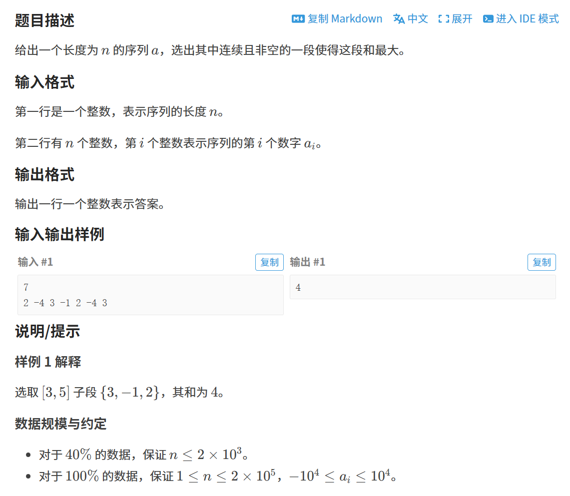 利用前缀和进行预处理,再遍历前缀和数组,计算每个位置的最大子段和并动态更新。