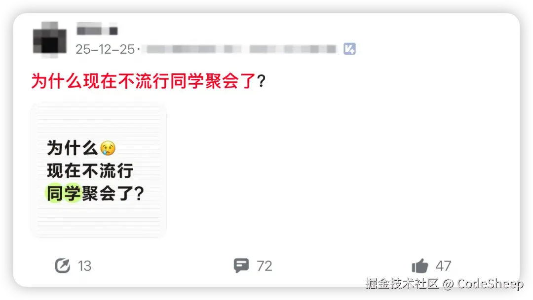 这时候我不禁想起了前段时间刷职场社区所看到的一个帖子:**为什么现在不流行同学聚会了?**参与讨论的同学也不少。
