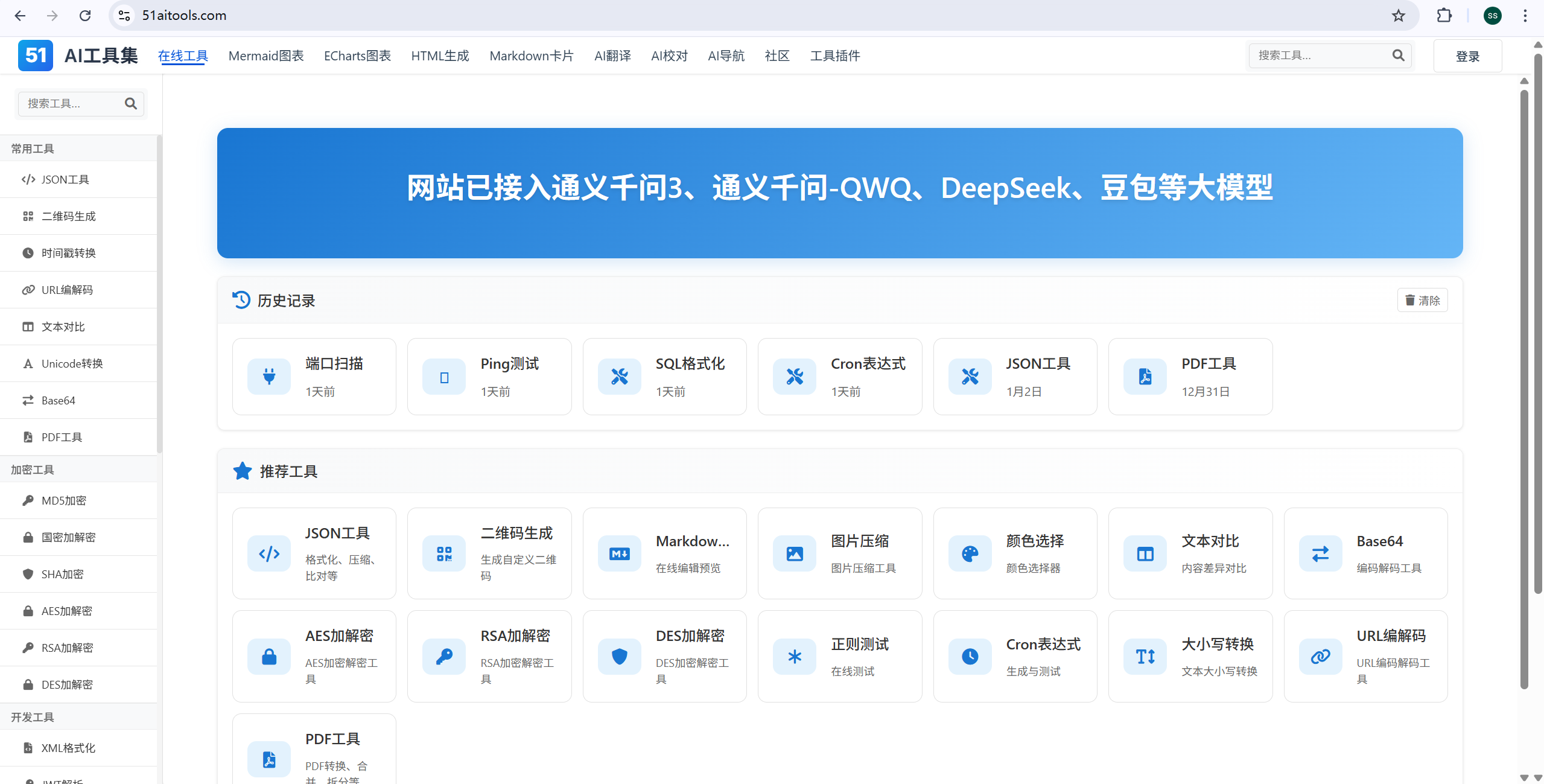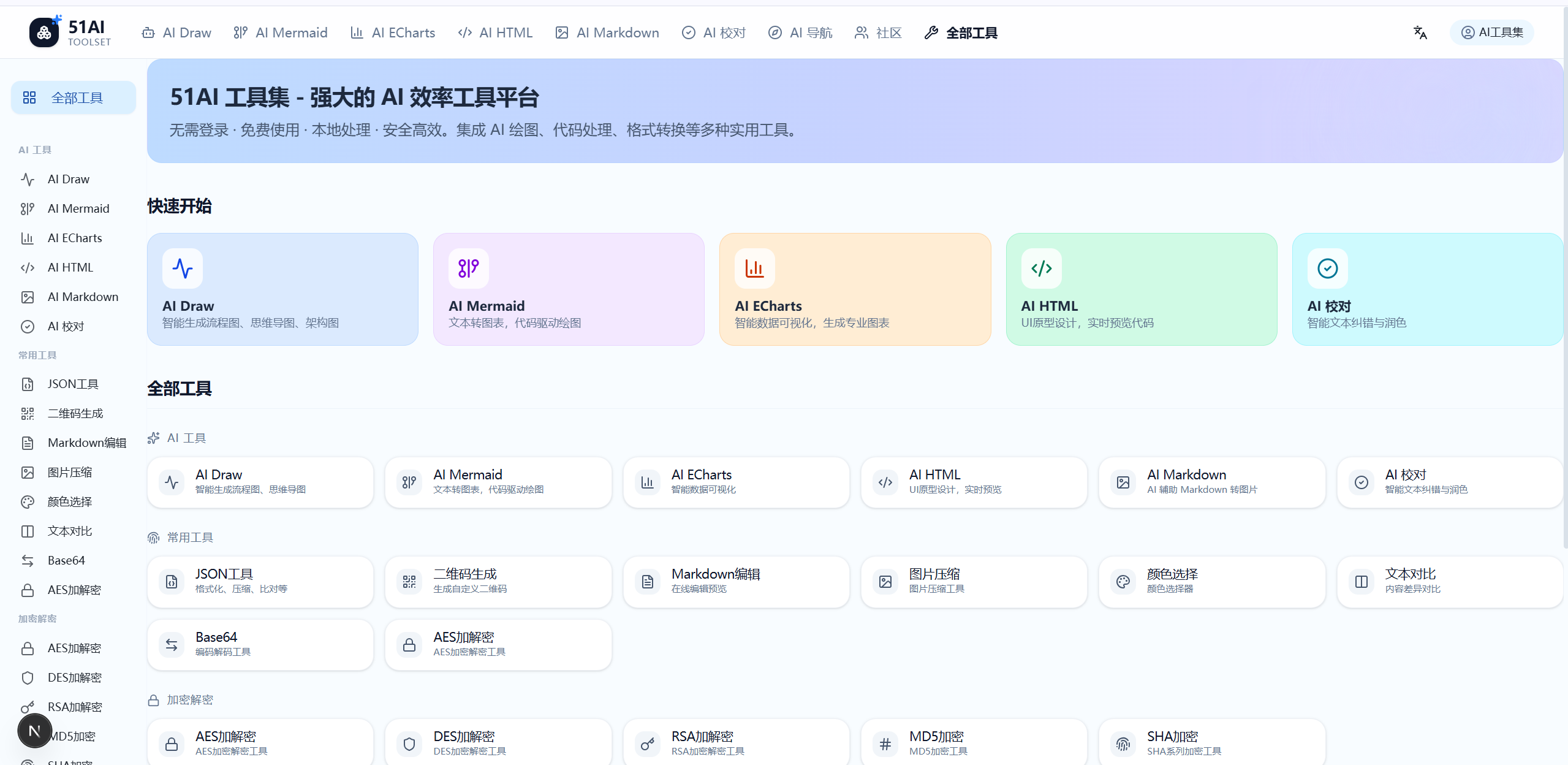 很多在线工具:AI Draw、AI Mermai、AI ECharts、AI HTML、AI Markdown、AI 校对、AI 导航、社区、json格式化\比对、二维码生成、各种加解密、文本比对等等
