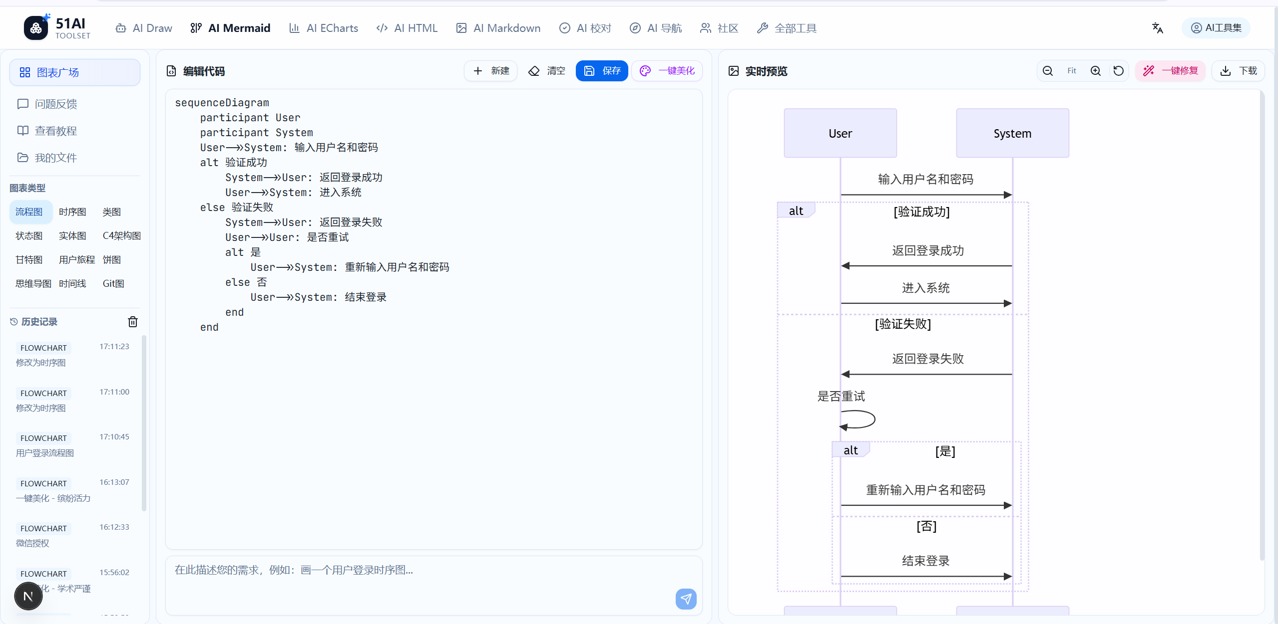 三、通过AI生成mermaid图表包括: