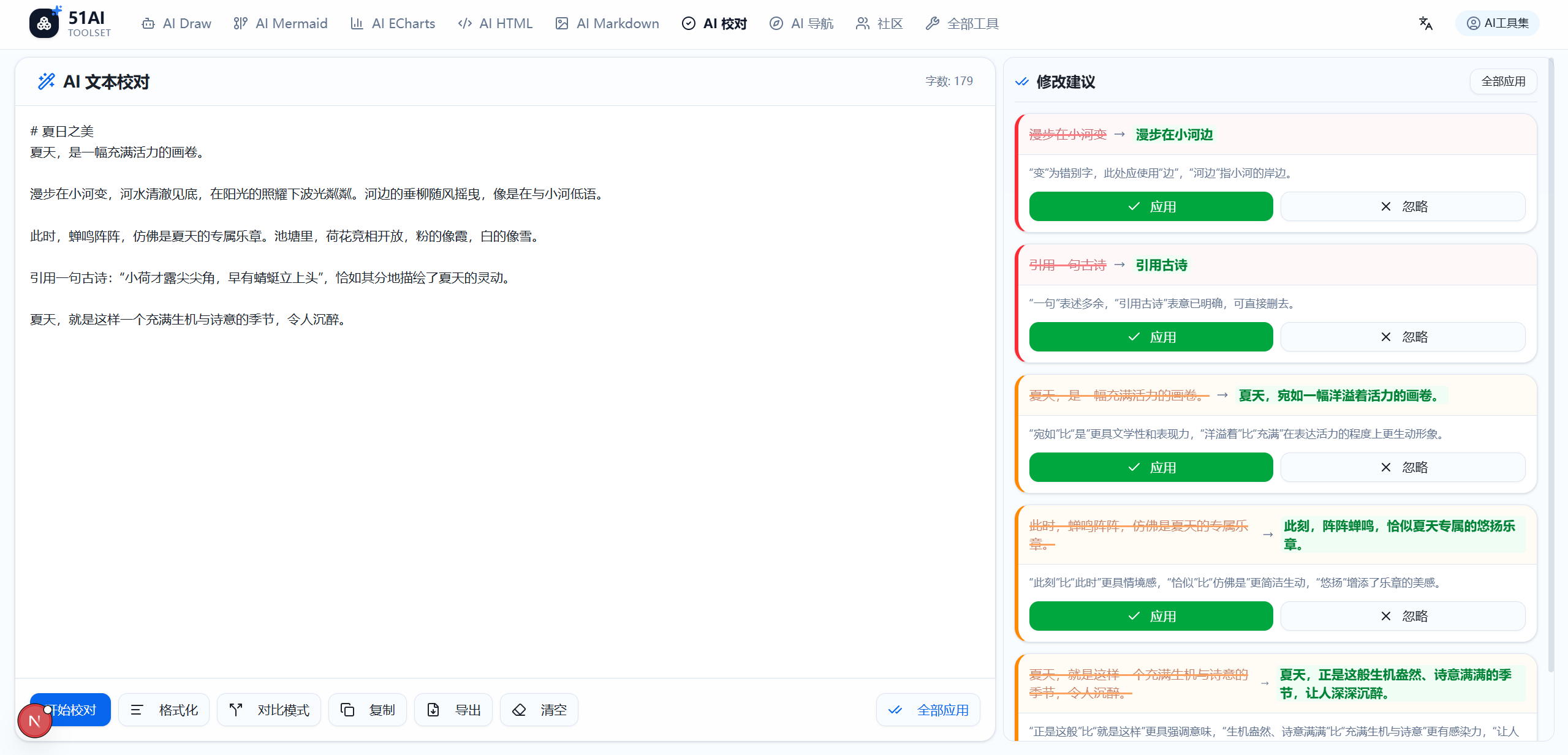 六、AI校对通过AI对文本进行分析,标记错误和优化。用户可以直接应用。如图: