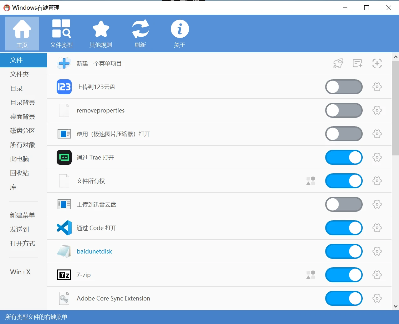 它最核心的能力是"精细化分类管理",把右键菜单按"文件""文件夹""磁盘分区""快捷方式"等不同对象拆分成独立模块,每个模块里的选项都能单独开关。比如针对"文件"的右键,我把常用的"通过Code打开""7-zip压缩"打开,把用不上的"上传到云盘""属性拓展"关掉;针对"磁盘分区",只保留"打开命令窗口""管理BitLocker"这类刚需选项,这样不同场景下的右键菜单都精准对应需求,再也不用在冗余选项里翻找。