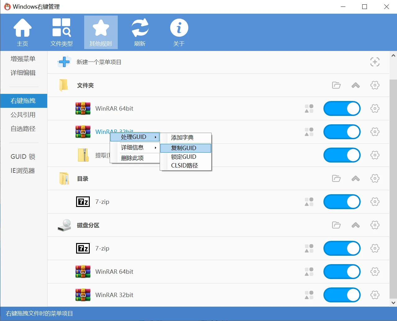 它的细节设计特别贴实用户习惯,比如支持按"文件类型"配置专属右键------给"exe文件"单独加"用沙箱打开",给"图片文件"加"极速压缩",不同类型文件的右键功能完全定制化;还有"右键拖拽"管理,能设置拖拽文件时弹出的菜单选项,连拖拽这种小众操作都能优化。而且它还自带注册表备份功能,改坏了菜单直接恢复,不用怕操作失误。