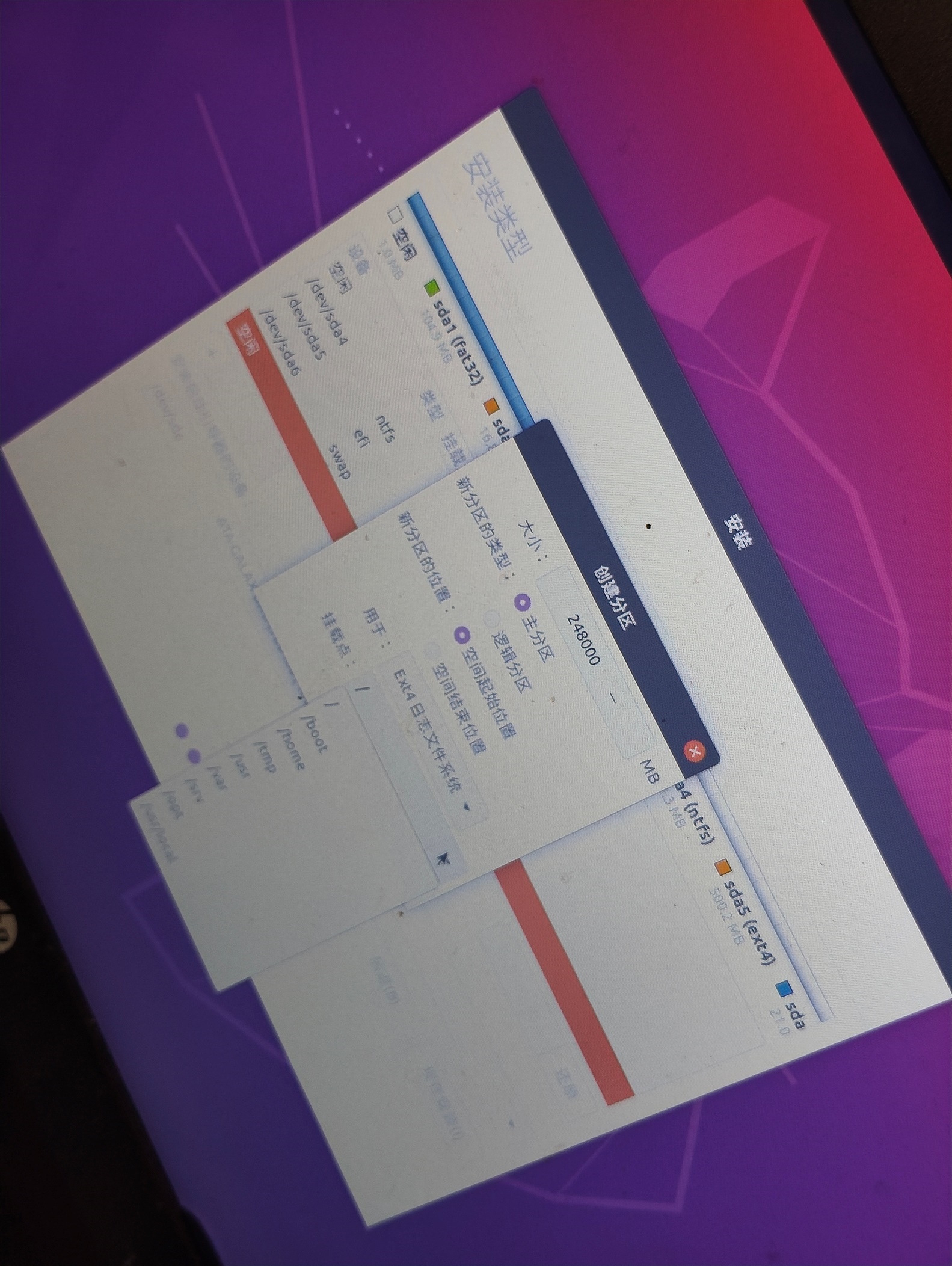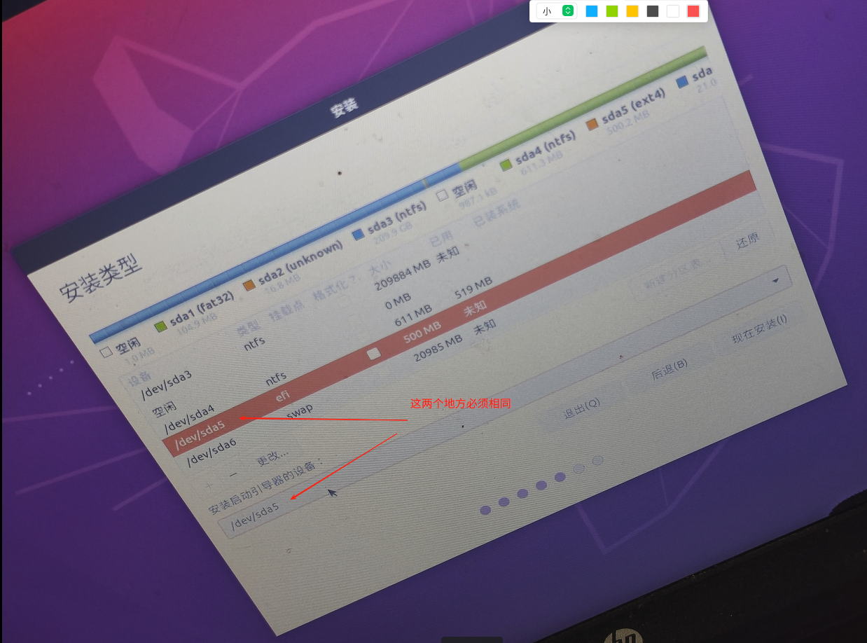 2.1.2.14继续在【安装类型】界面的"分区"界面,找到硬盘的空闲区域,把引导安装到新创建的EFI分区(本文时/dev/sda5), 千万别把引导安装到window的EFI分区