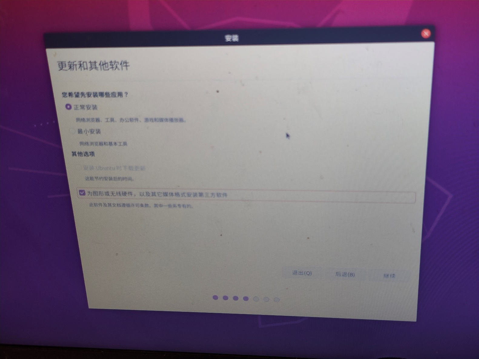 建议选择【正常安装】和【为图形或无线硬件,以及其它媒体格式安装第三方软件】,