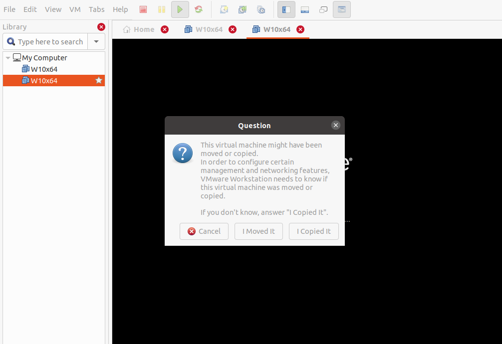 第四步、启动windows虚拟机弹出提示框,选择"I Copyied It"按钮